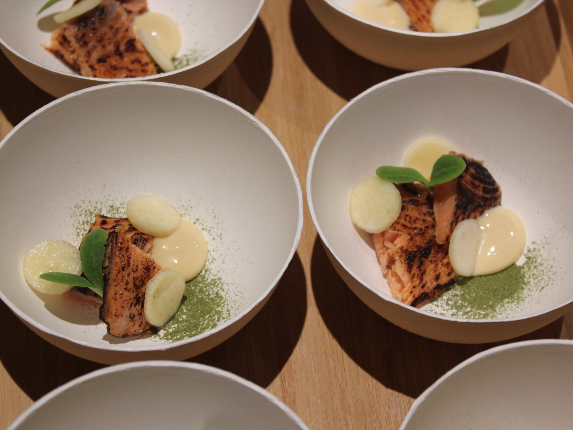 Zalm, gele biet, sushi-azijn, meso, gemberpasta, Japanse mayo, algenpoeder, zeevenkel.