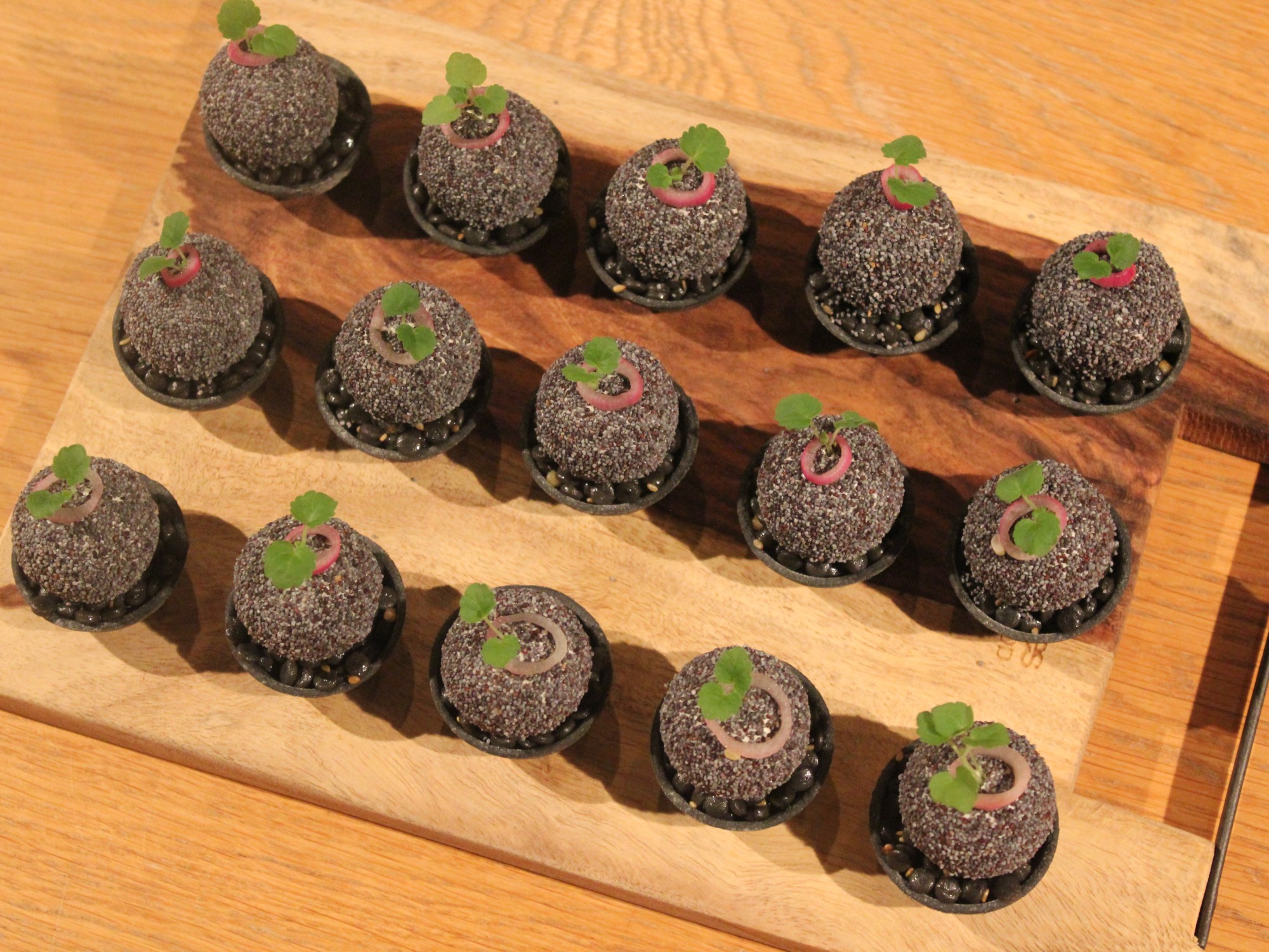 Kogel van mascarpone met ansjovis |blauw maanzaad | fregola nero | kameya rijstkruiden | crispy cup | sjalotten ringetje in sushiazijn.
