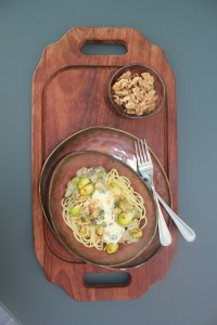 Spaghetti, spruitjes, gorgonzola, okkernoten