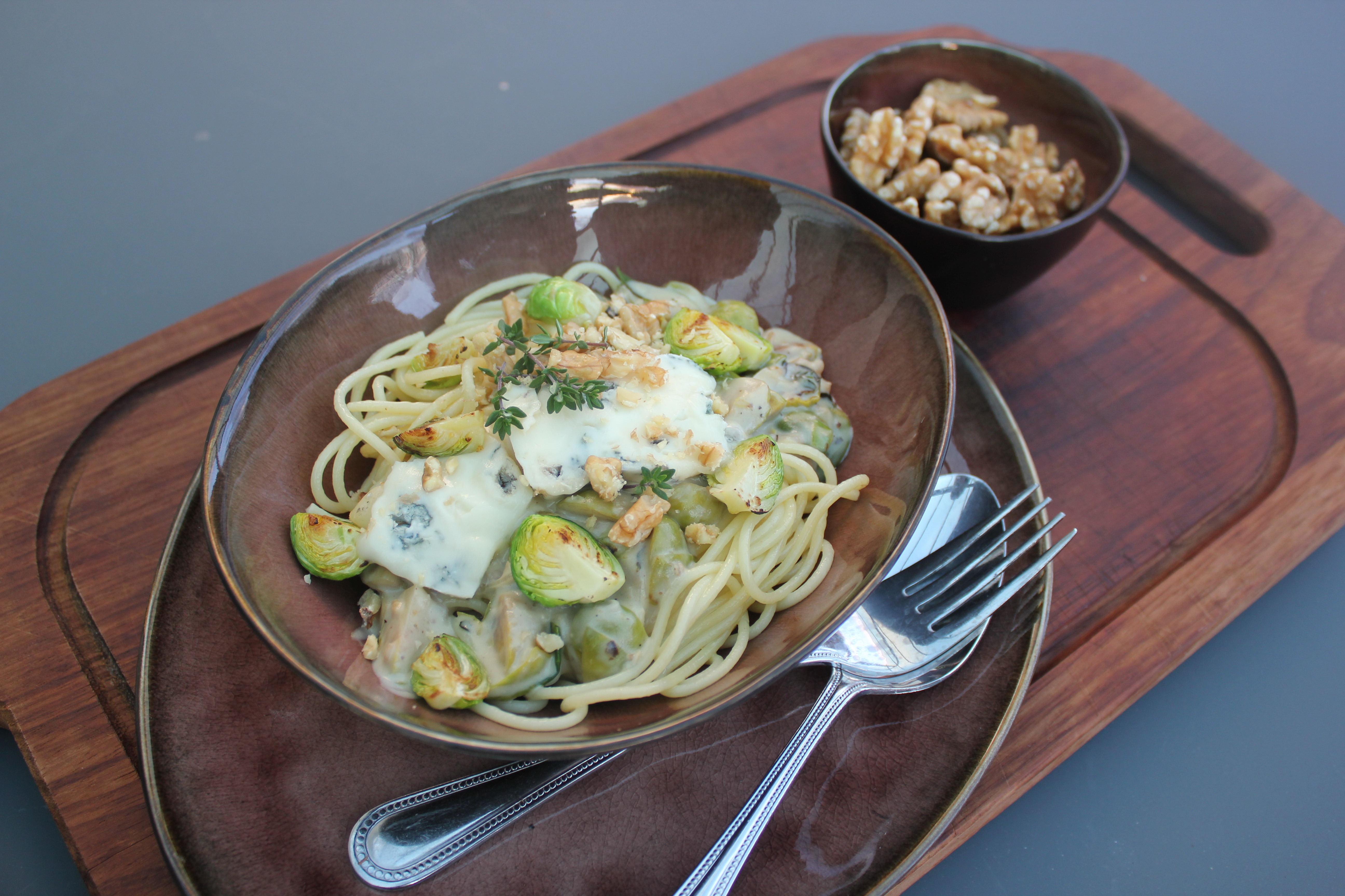 Spaghetti, spruitjes, gorgonzola, okkernoten