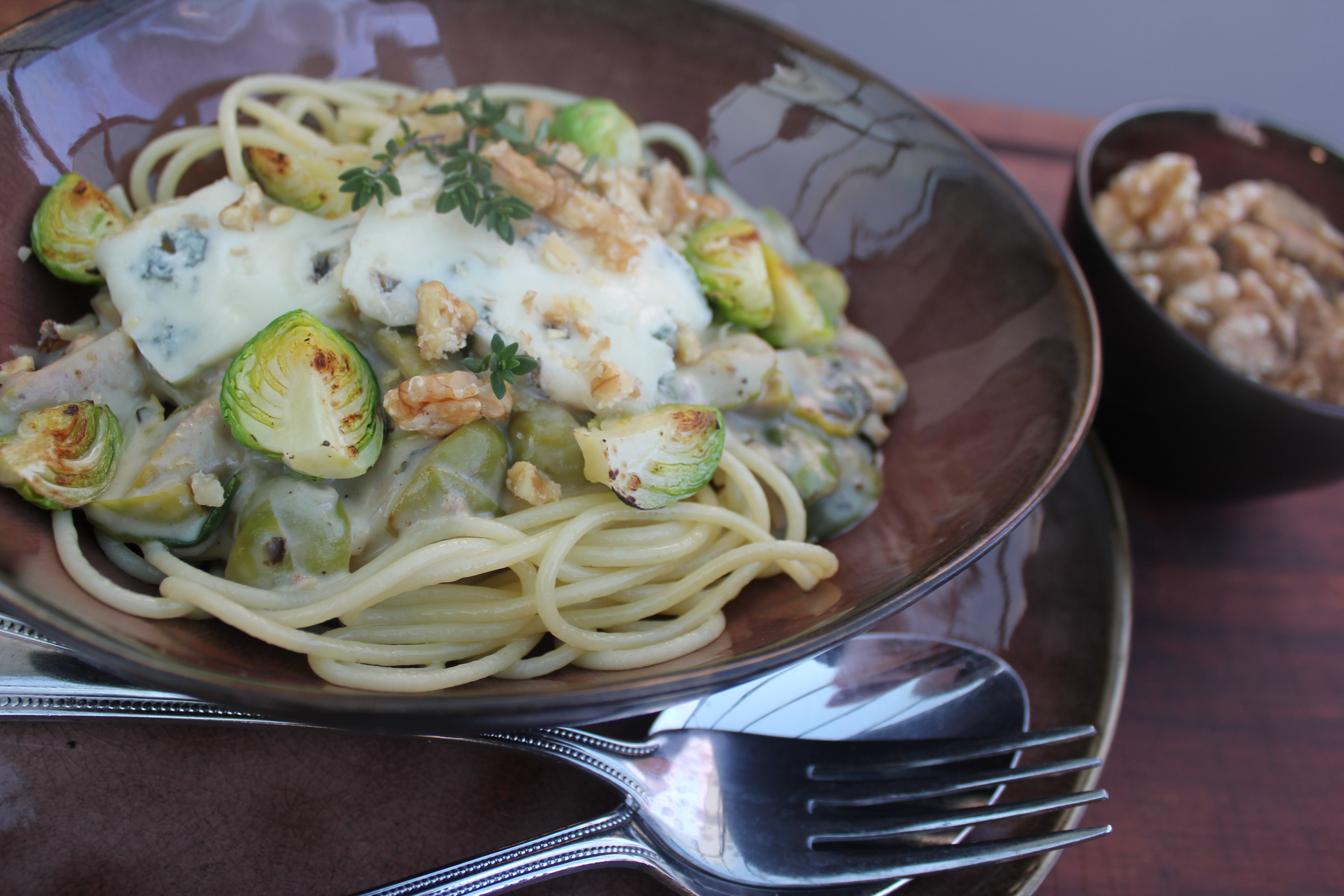 Spaghetti, spruitjes, gorgonzola, okkernoten