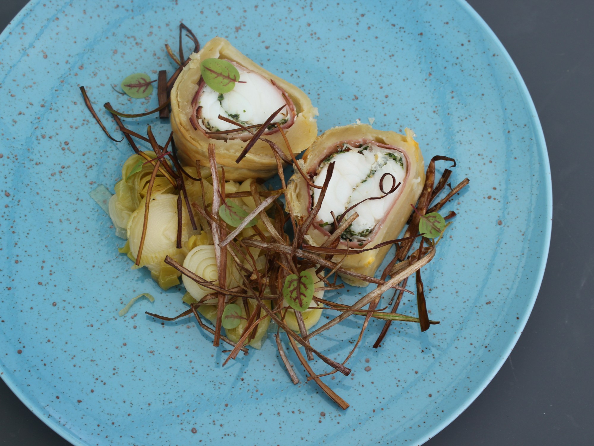 Zeeduivelfilet | prei op 2 wijzen | gember | dragon | munt | Schwartwalder schinken | bladerdeeg