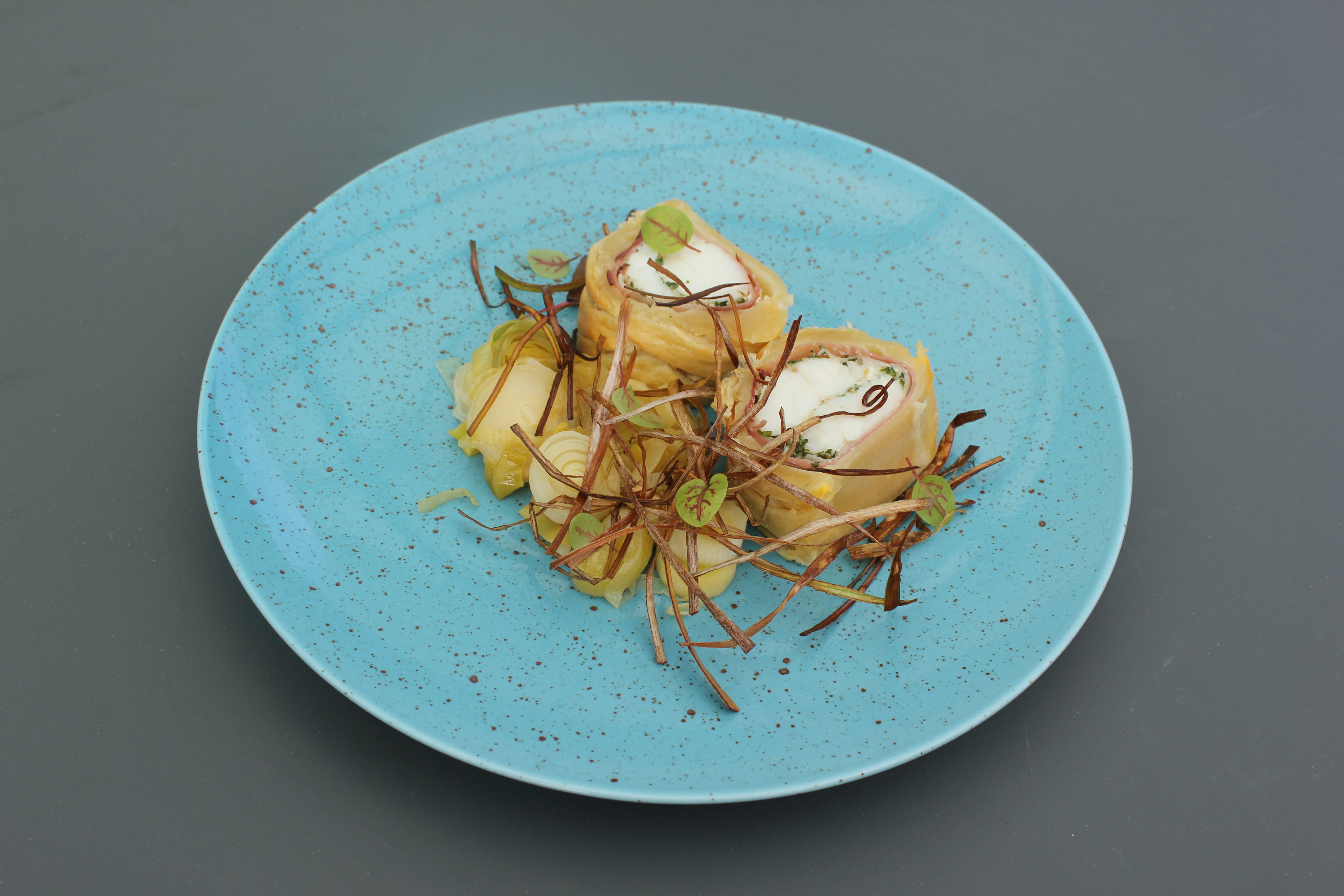 Zeeduivel, bladerdeeg, hesp, prei