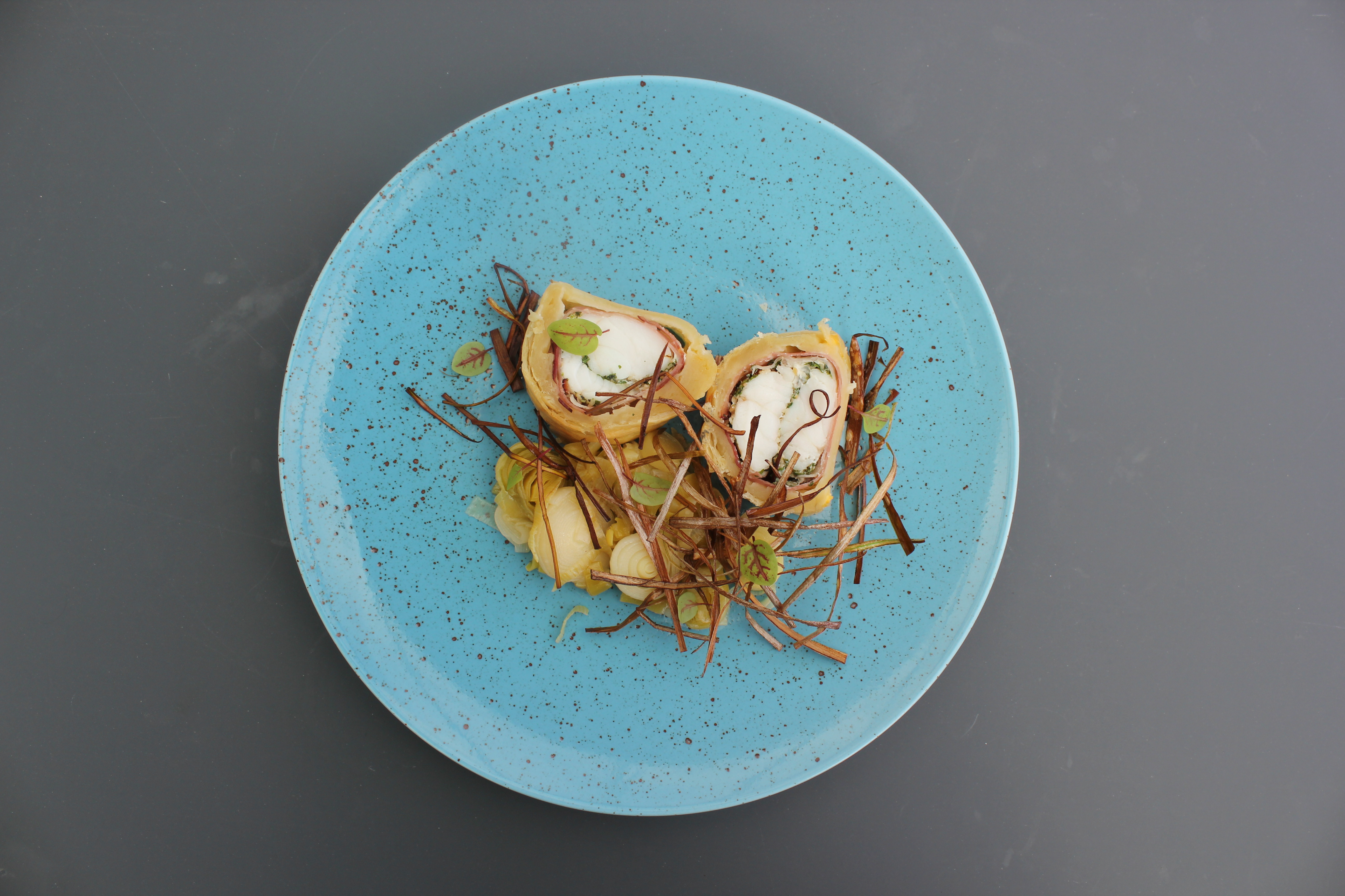 Zeeduivel, bladerdeeg, hesp, prei