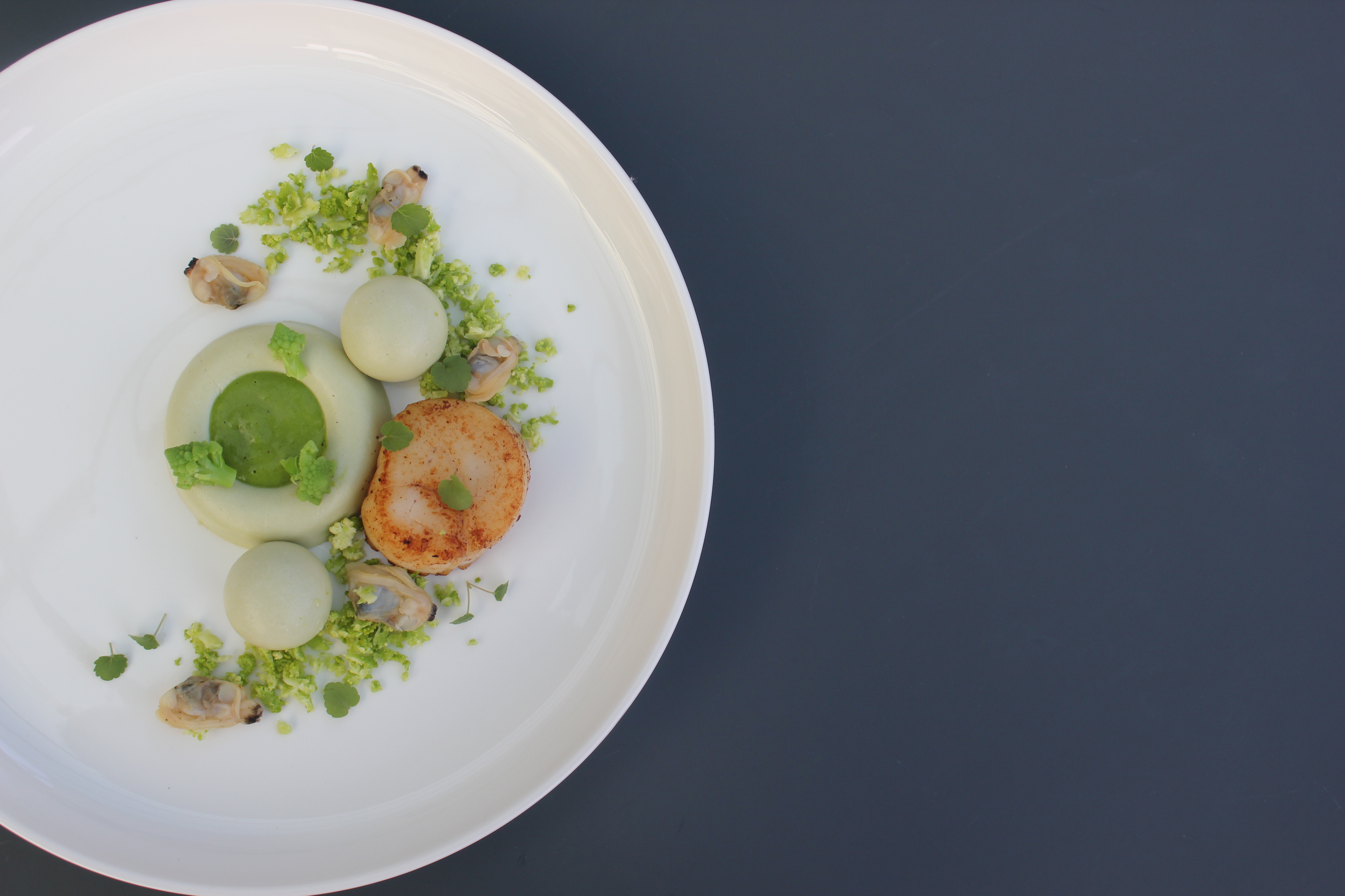 Coquilles, amandes, crème van Romanesco