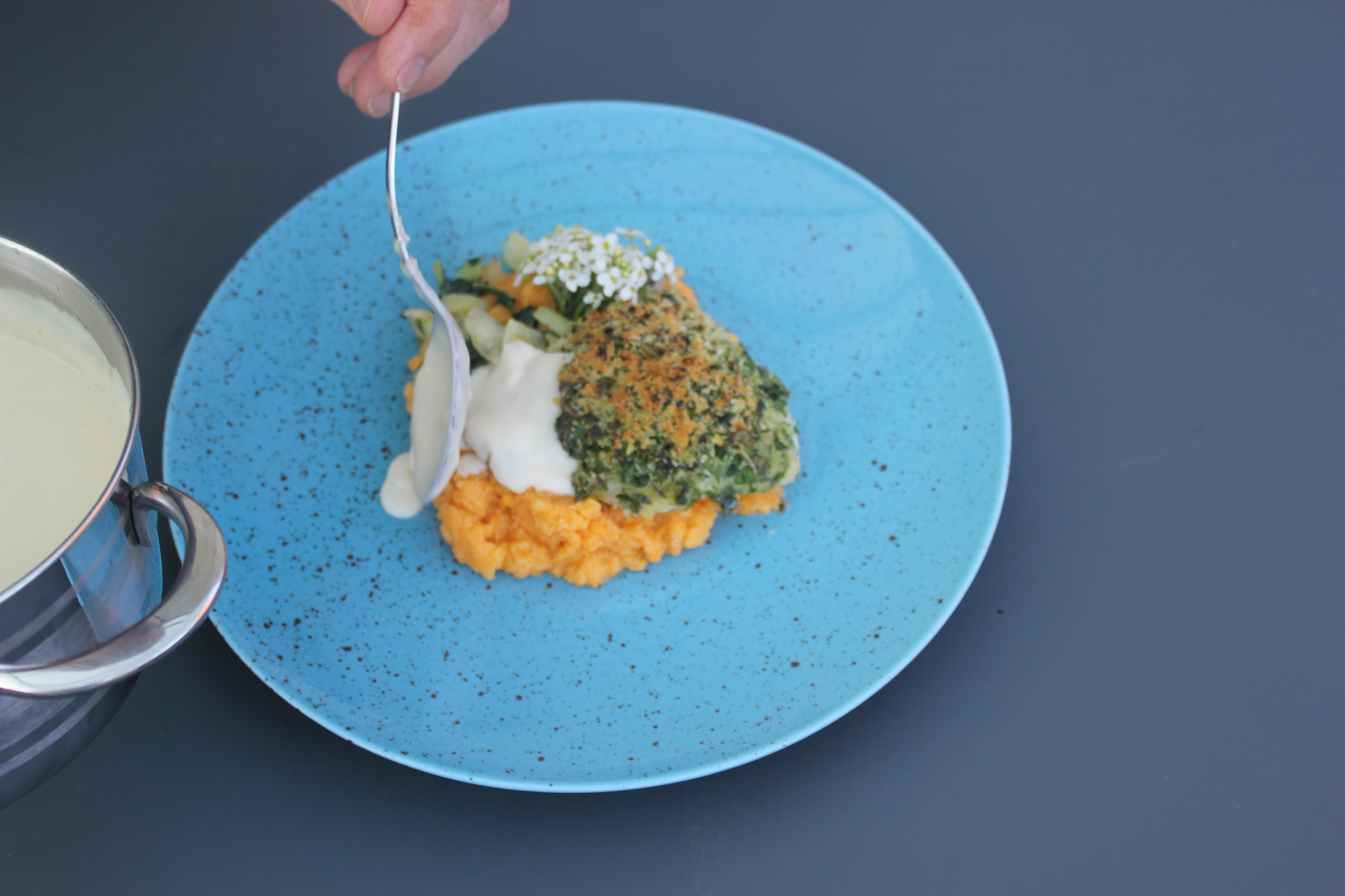 Barramundi, kruidenkorst, Paksoi, zoete aardappel