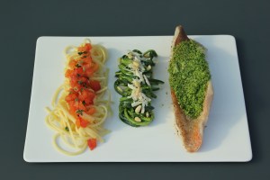 Roodbaars, courgette, pasta