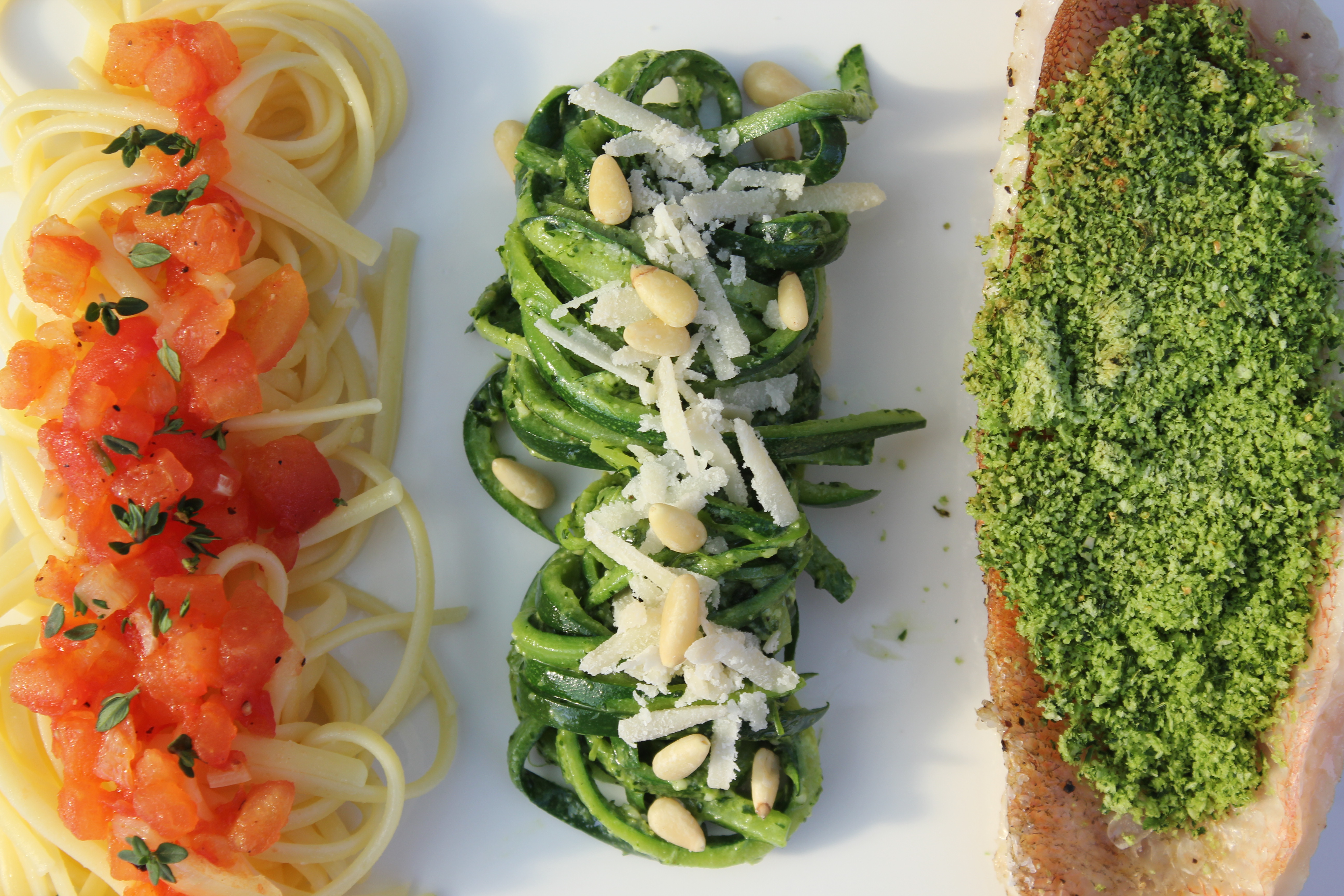 Roodbaars, courgette, pasta