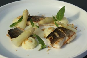 Zeebaars, asperges, aardappelcrème