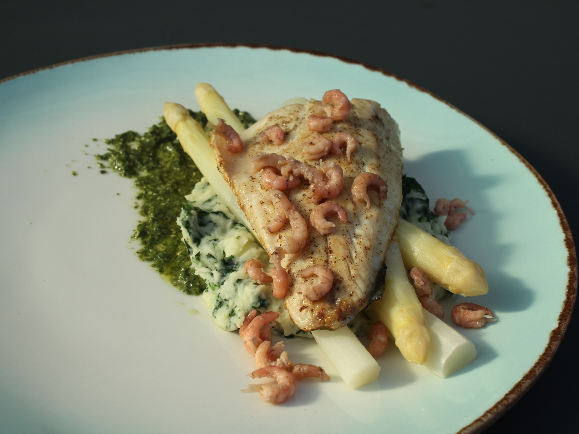 Gebakken zeebaars | asperges |spinazie pesto | puree met spinazie