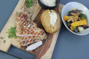 Tomahawk Steak van varken, gepofte aardappel, geroosterde groentjes
