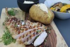 Tomahawk Steak van varken, gepofte aardappel, geroosterde groentjes