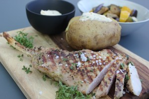 Tomahawk Steak van varken, gepofte aardappel, geroosterde groentjes