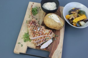 Tomahawk Steak van varken, gepofte aardappel, geroosterde groentjes