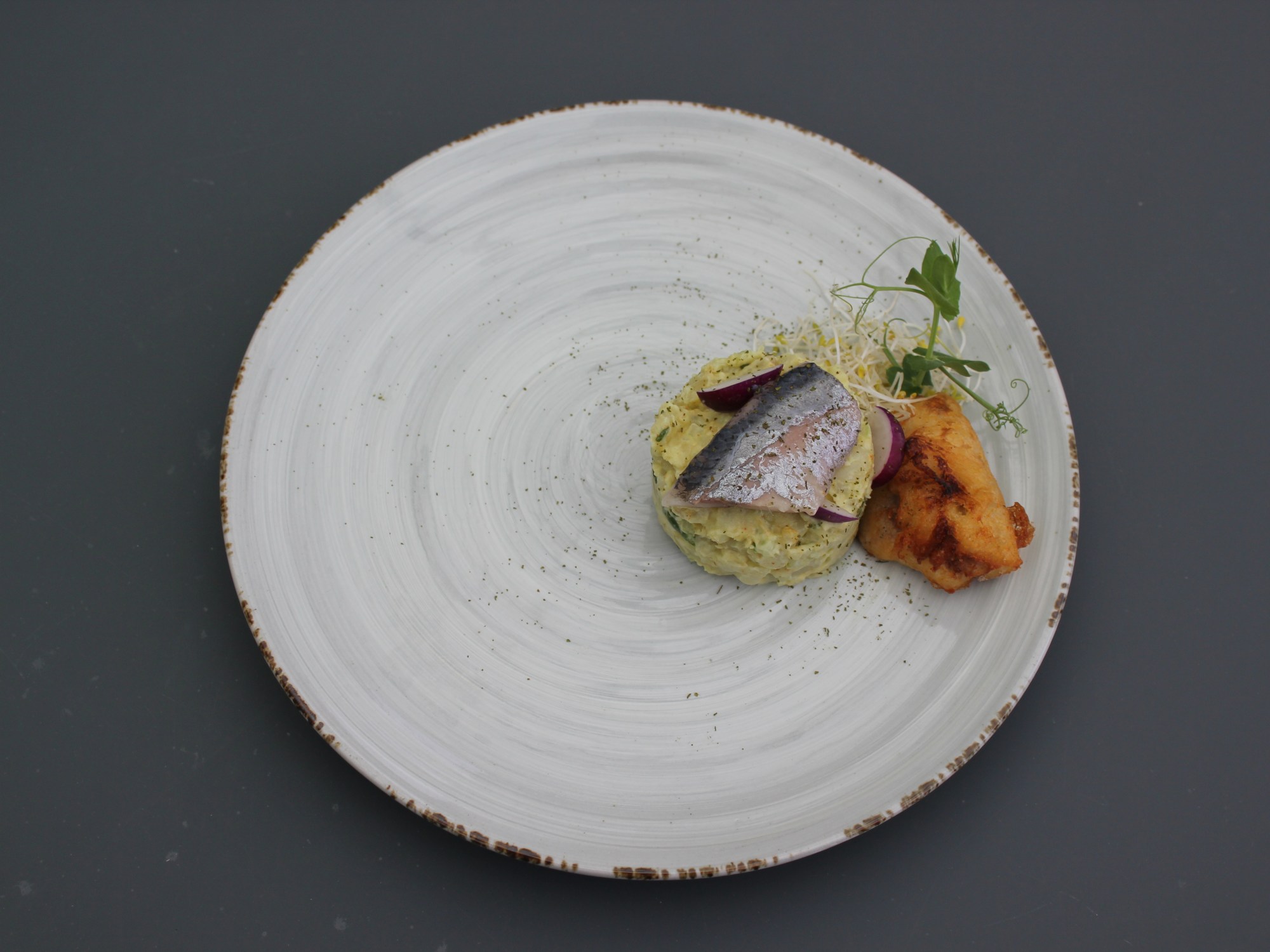 Aardappelsalade van ratte aardappel | avocado | bleekselder | gestoofde zeekraal | mierikswortel | maatjesharing | gefrituurde haring |