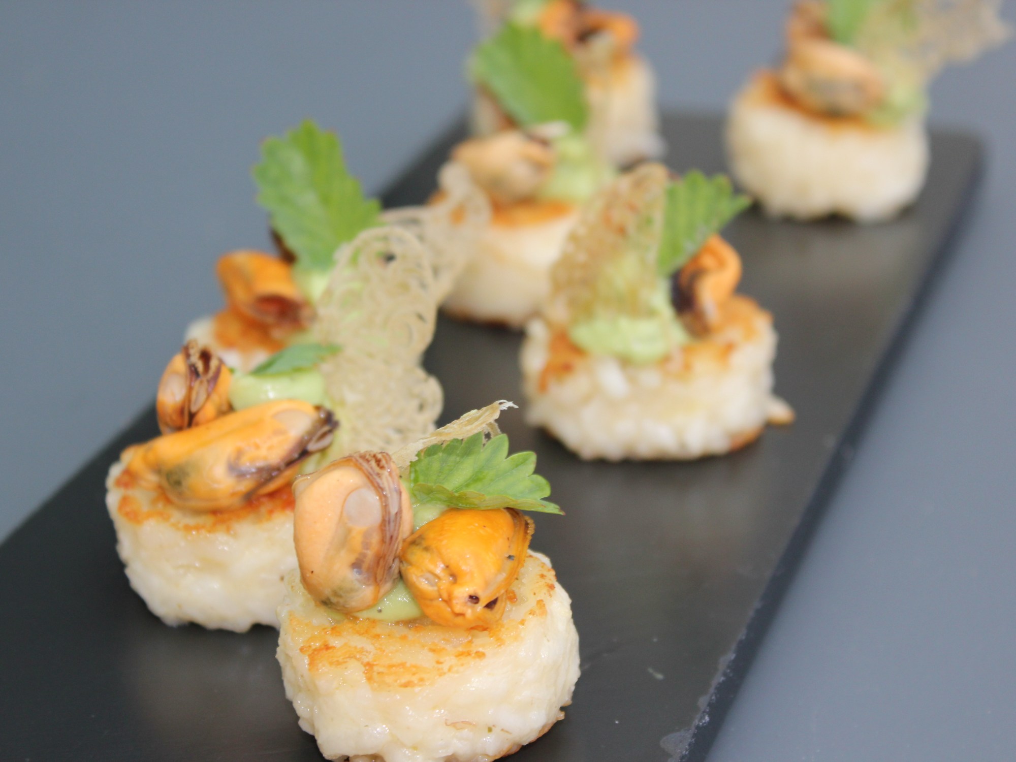 Gebakken risotto | mosselen | crème van avocado met yuzusap | krokantje van rijst en vadouvan | saus van mosselen |