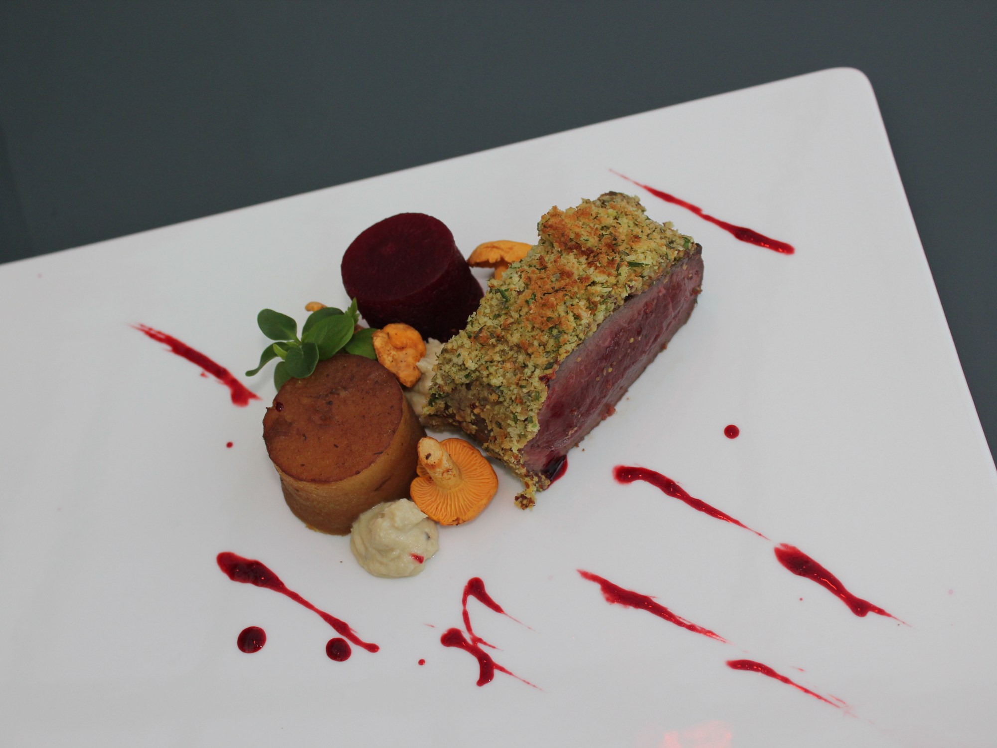 Rugfilet van Hollands boerderijhert / cantharellen / rode biet in steranijs / artisjokkencrème / pommes fondant met vadouvan / kruitencroute van bieslook, peterselie, dragon, briochebrood op grove mosterd / siroop van rode bieten /