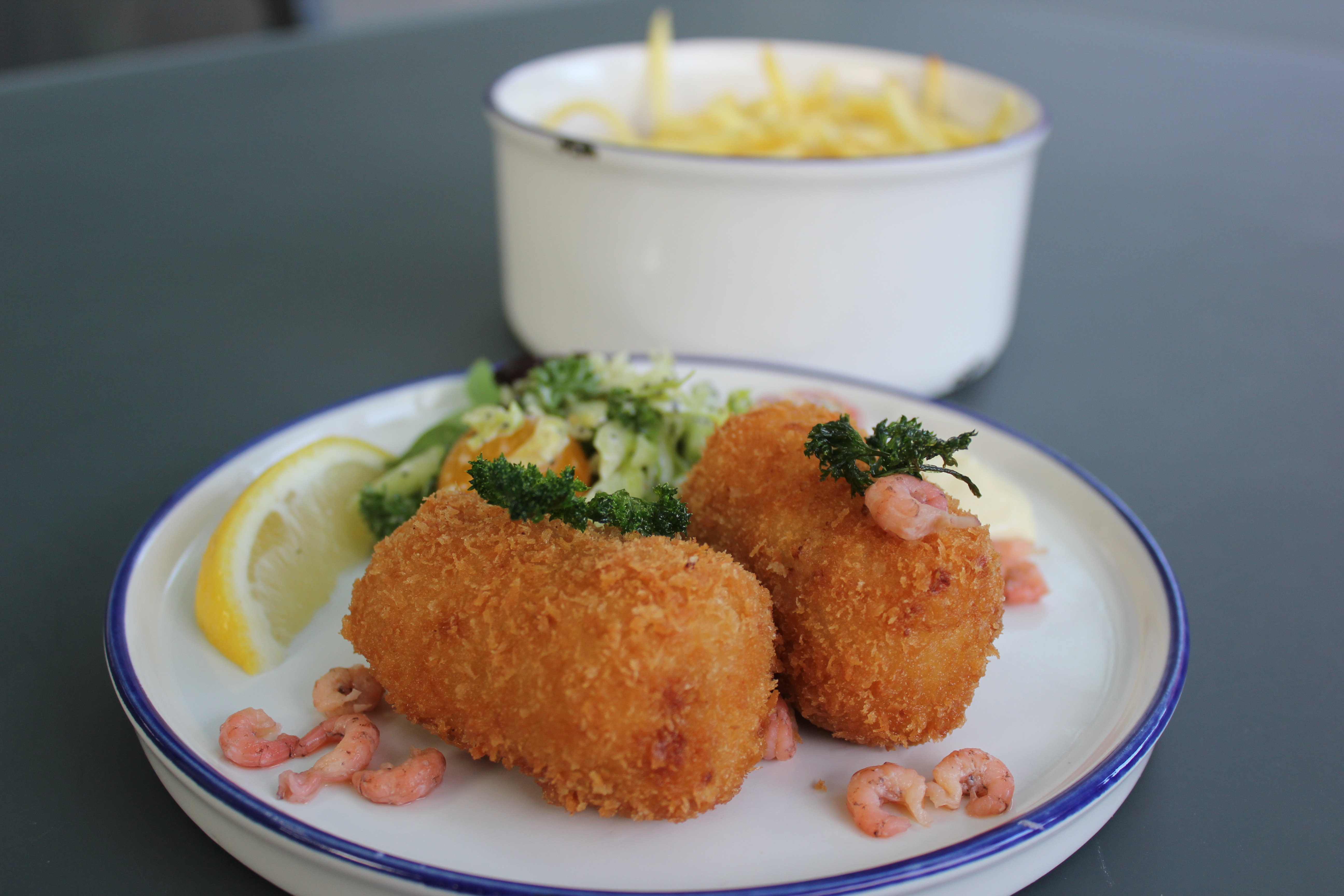 Garnaalkroket, salade, frietjes