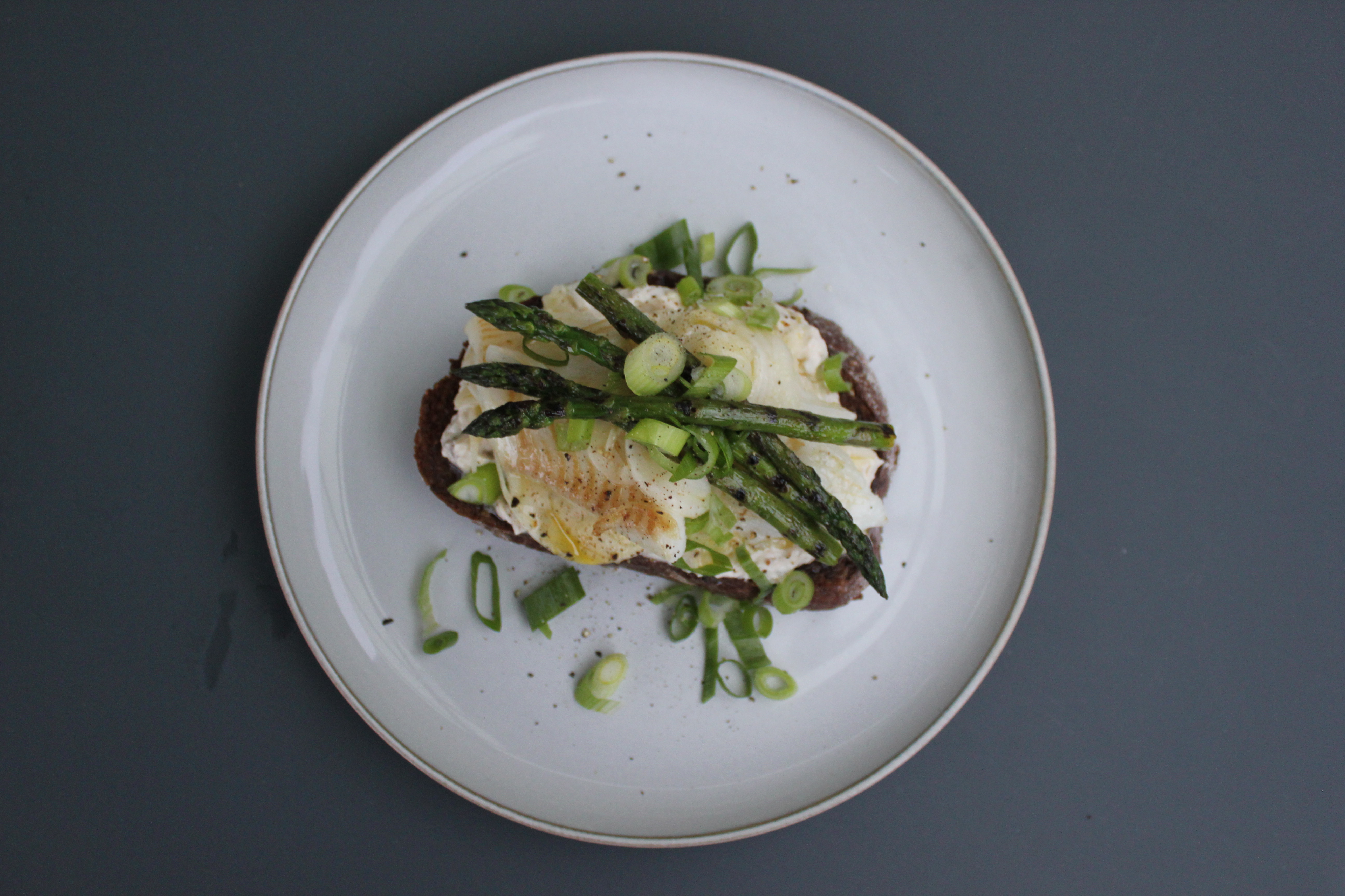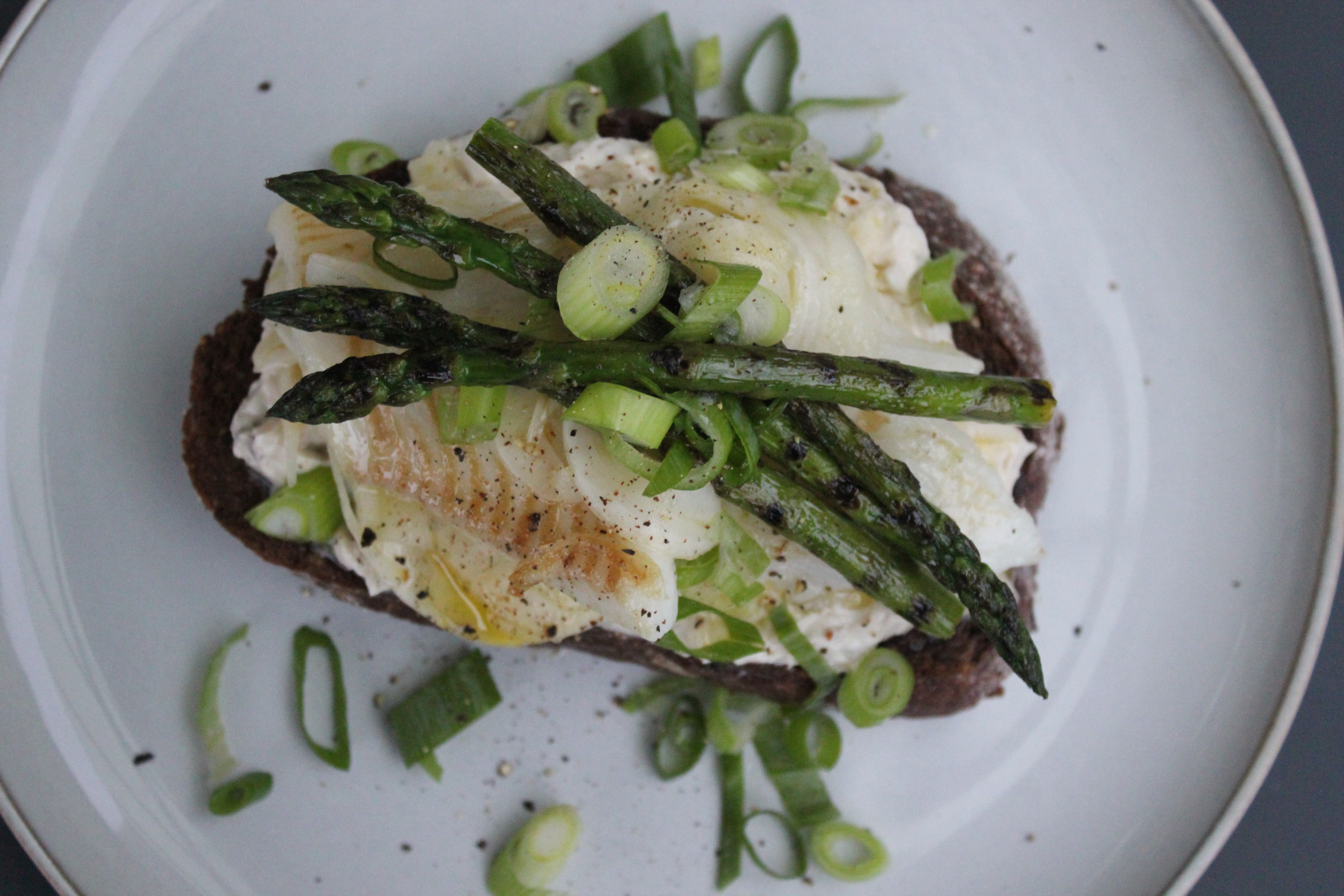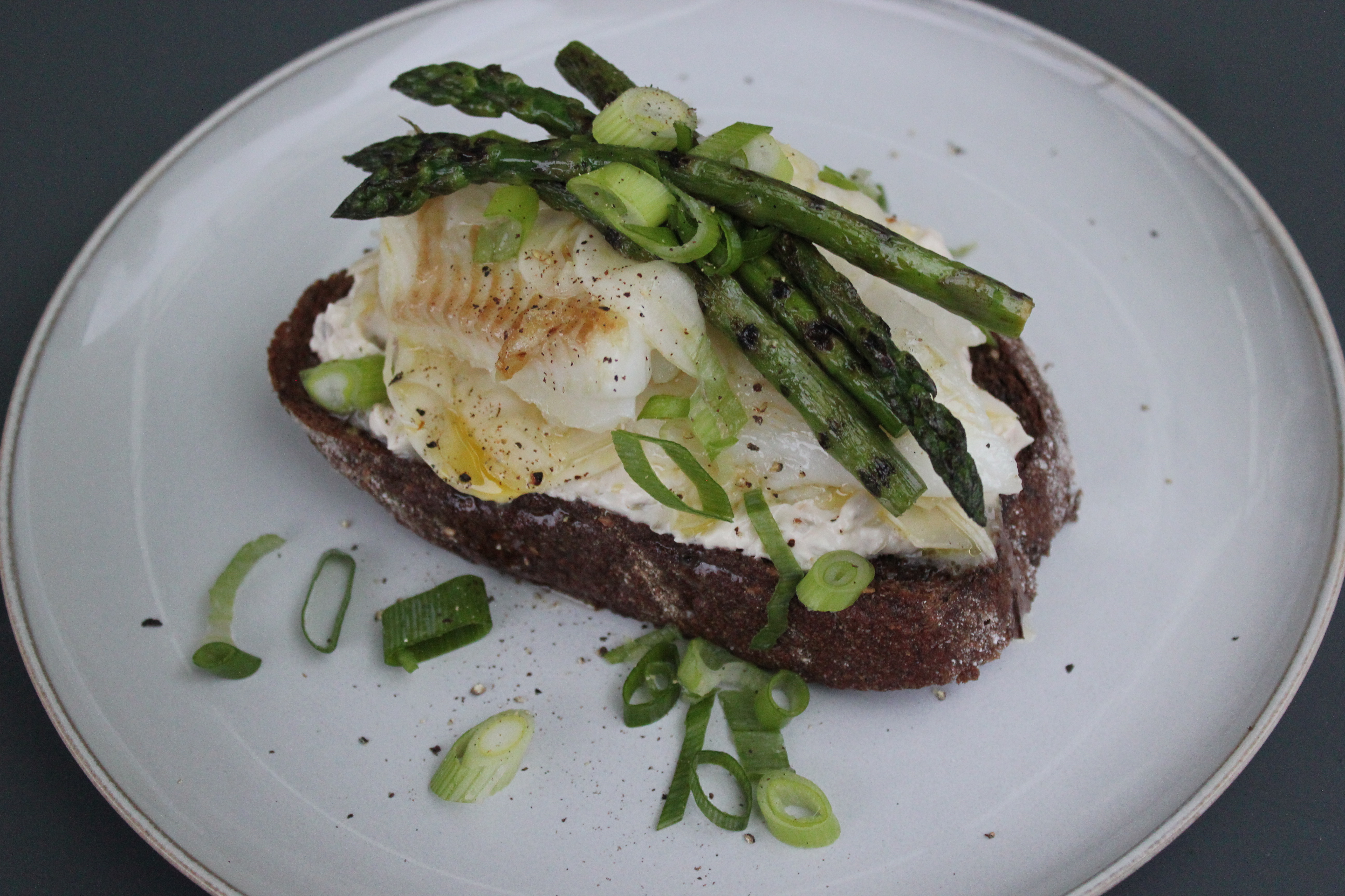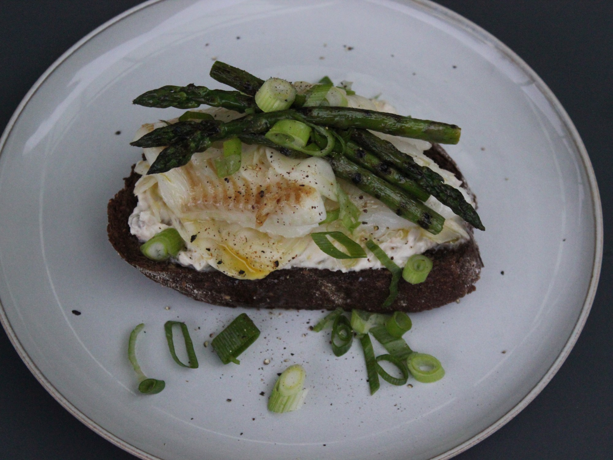 Bruschetta van zuurdesembrood / tarbot / groene asperges / ansjovis roomkaas / venkelzaad / look / venkel in een marinade / lente-uitjes