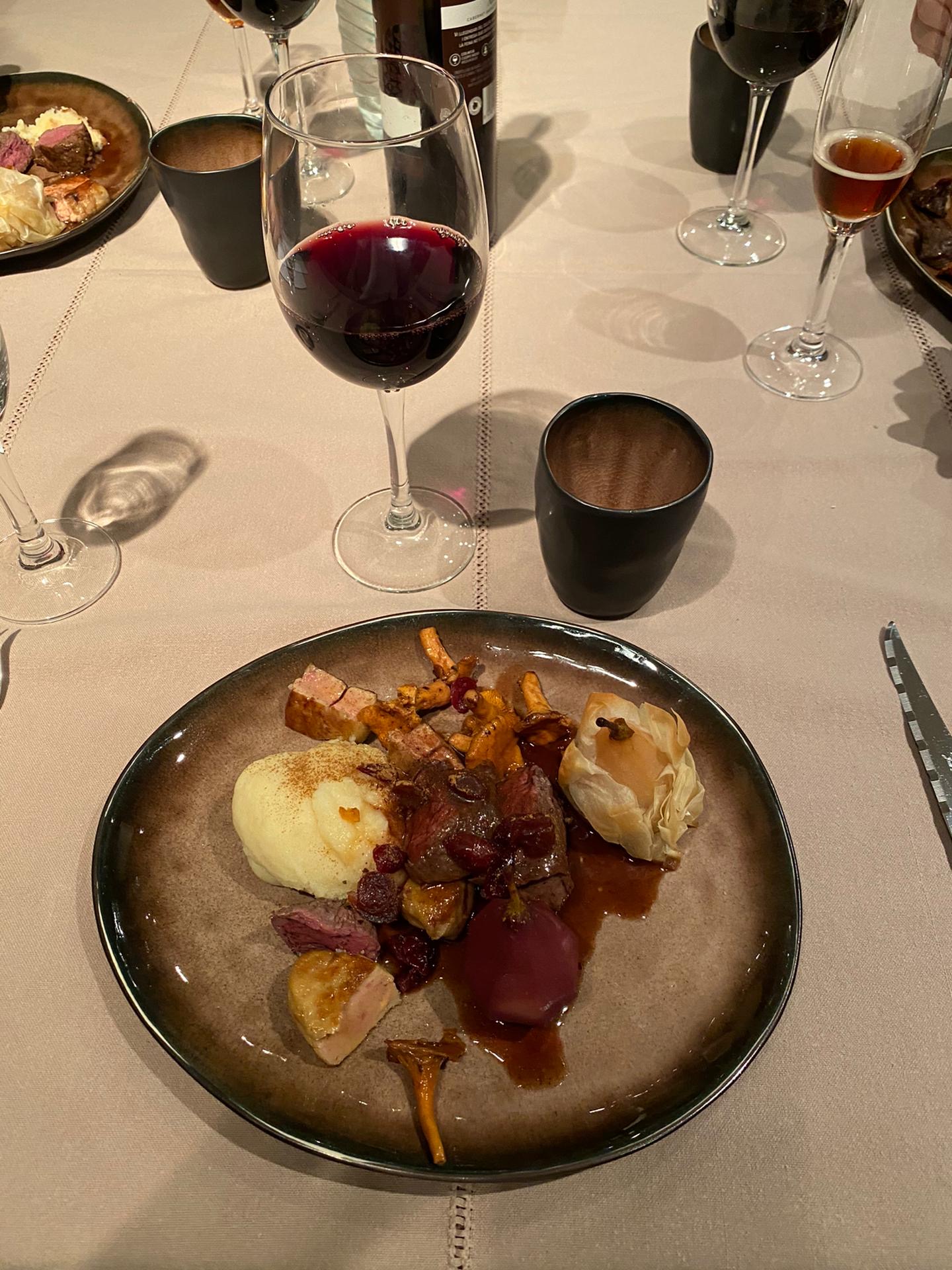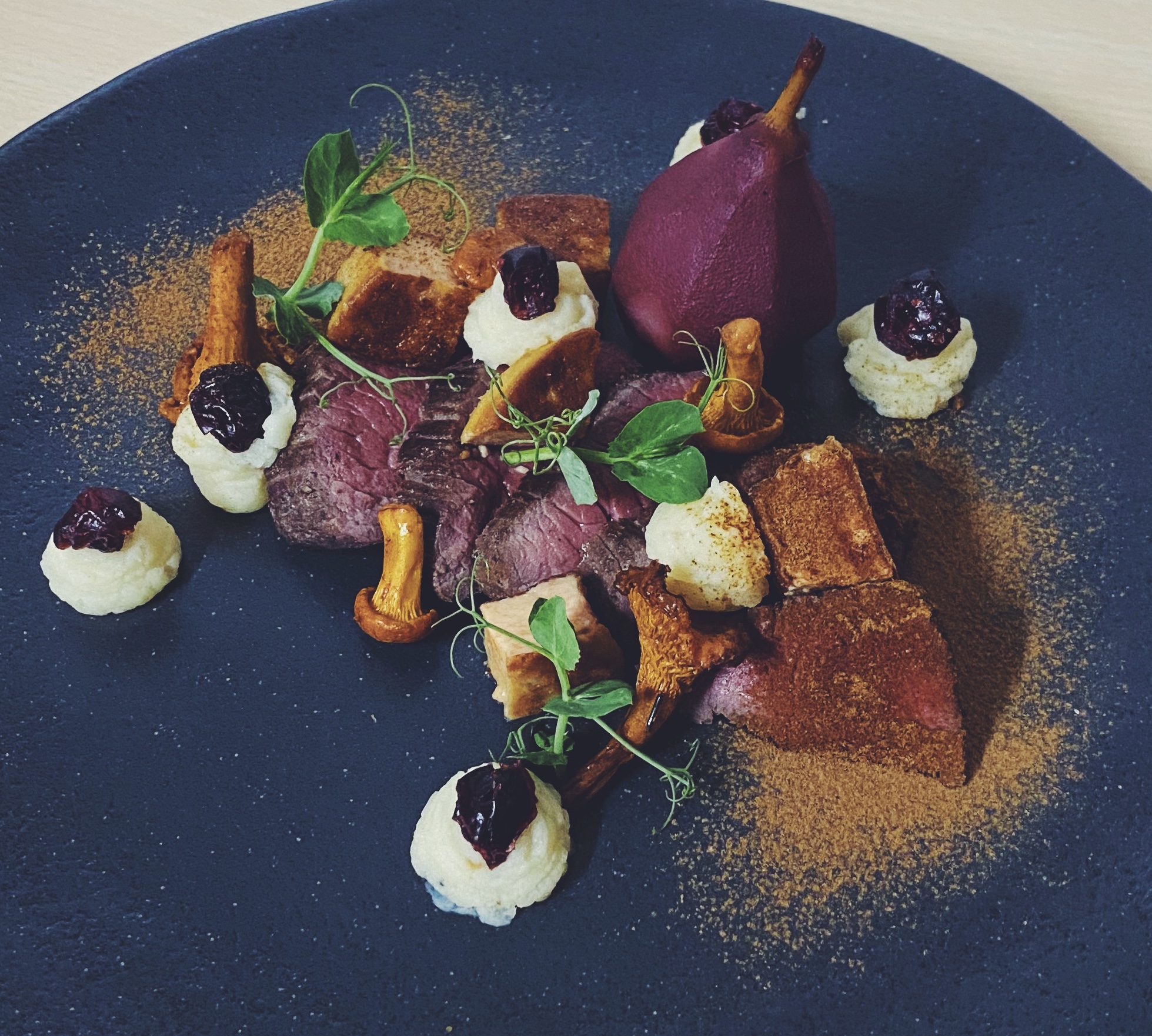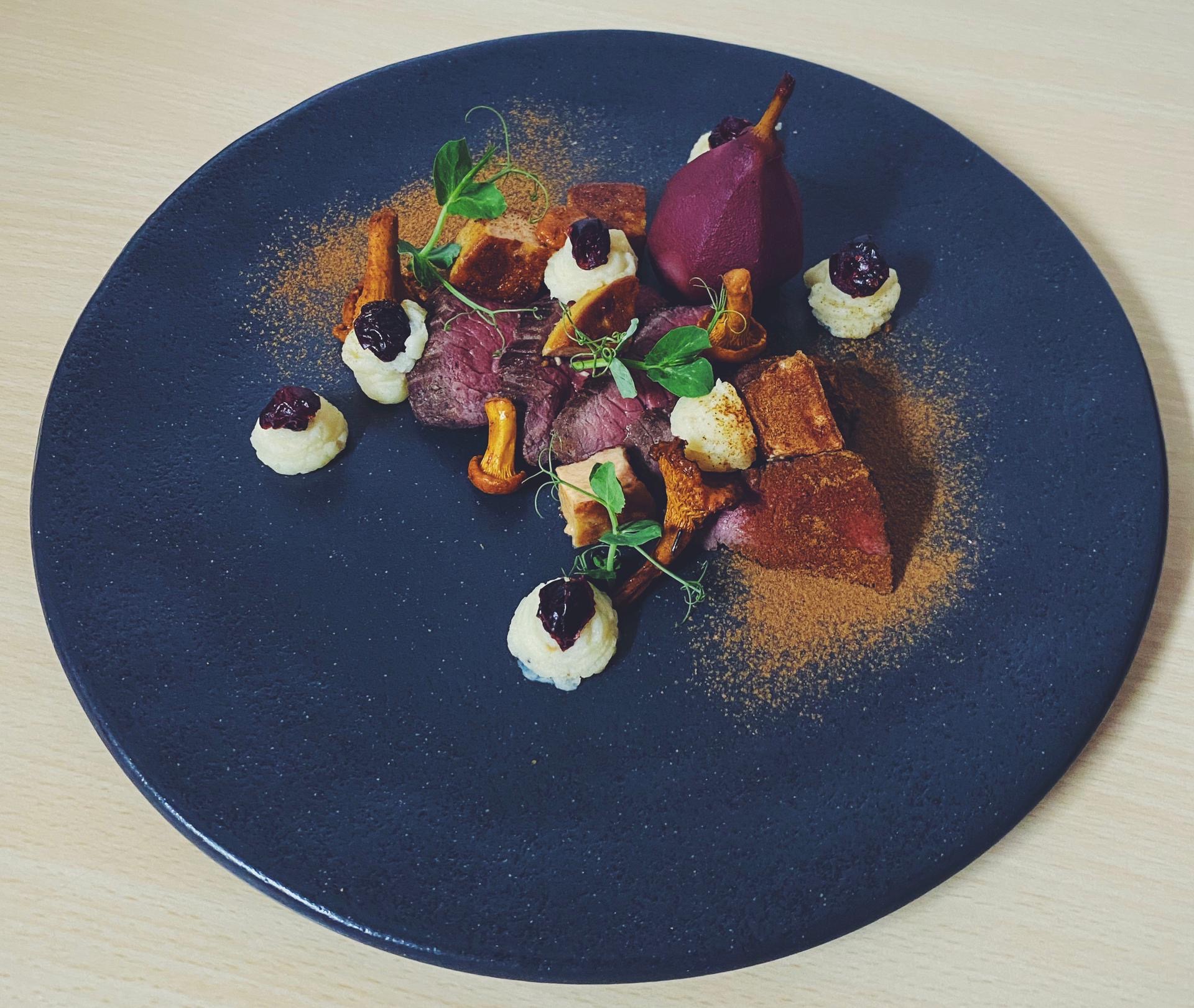 Hertenbiefstuk / peertjes in rode wijn / cantharellen / escalope de foie d’oie / puree van knolselder en truffel / veenbessen / poeder van eekhoorntjesbrood / black garlic puree /