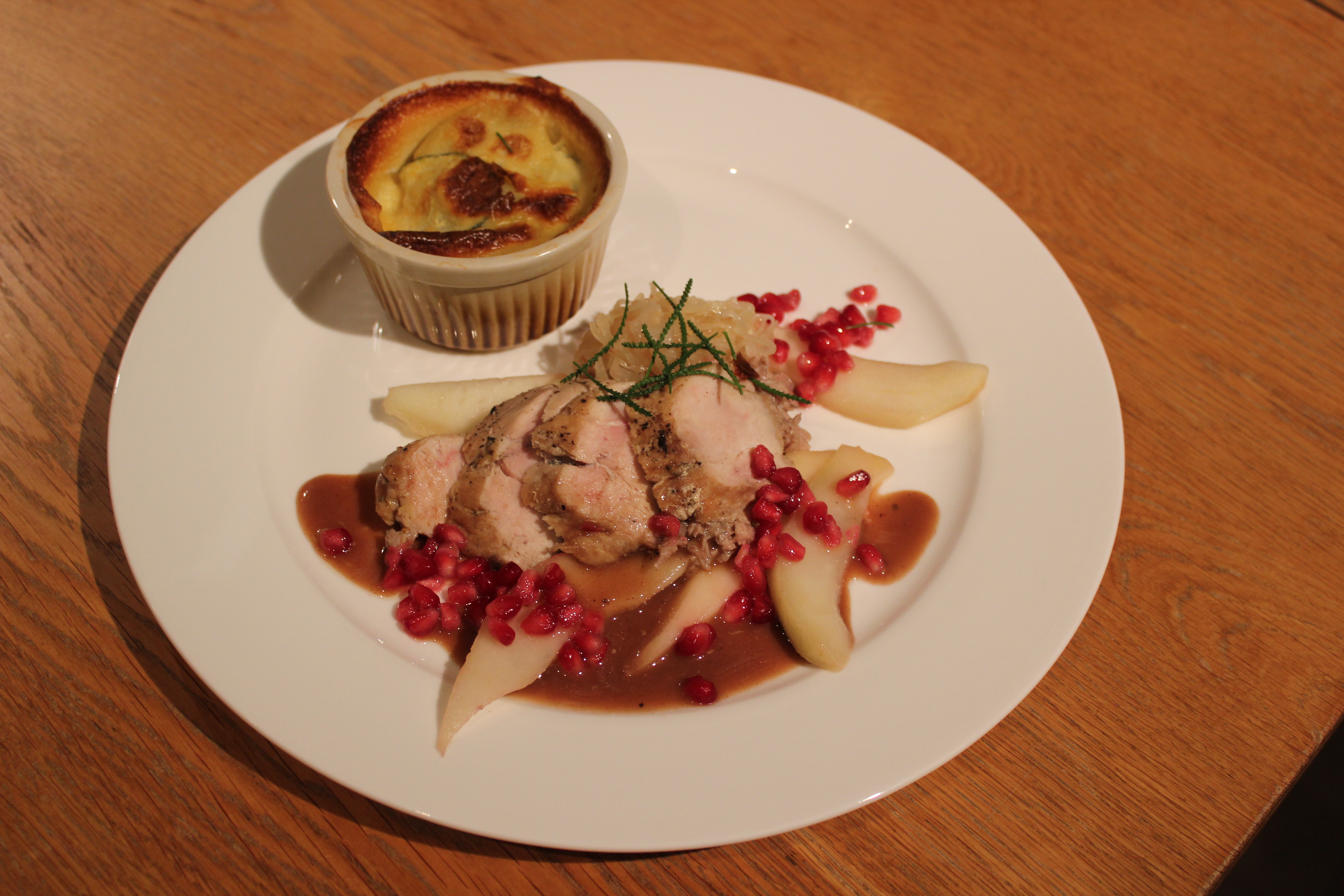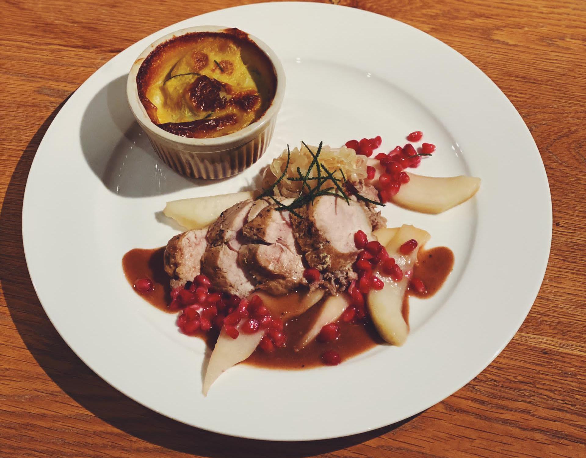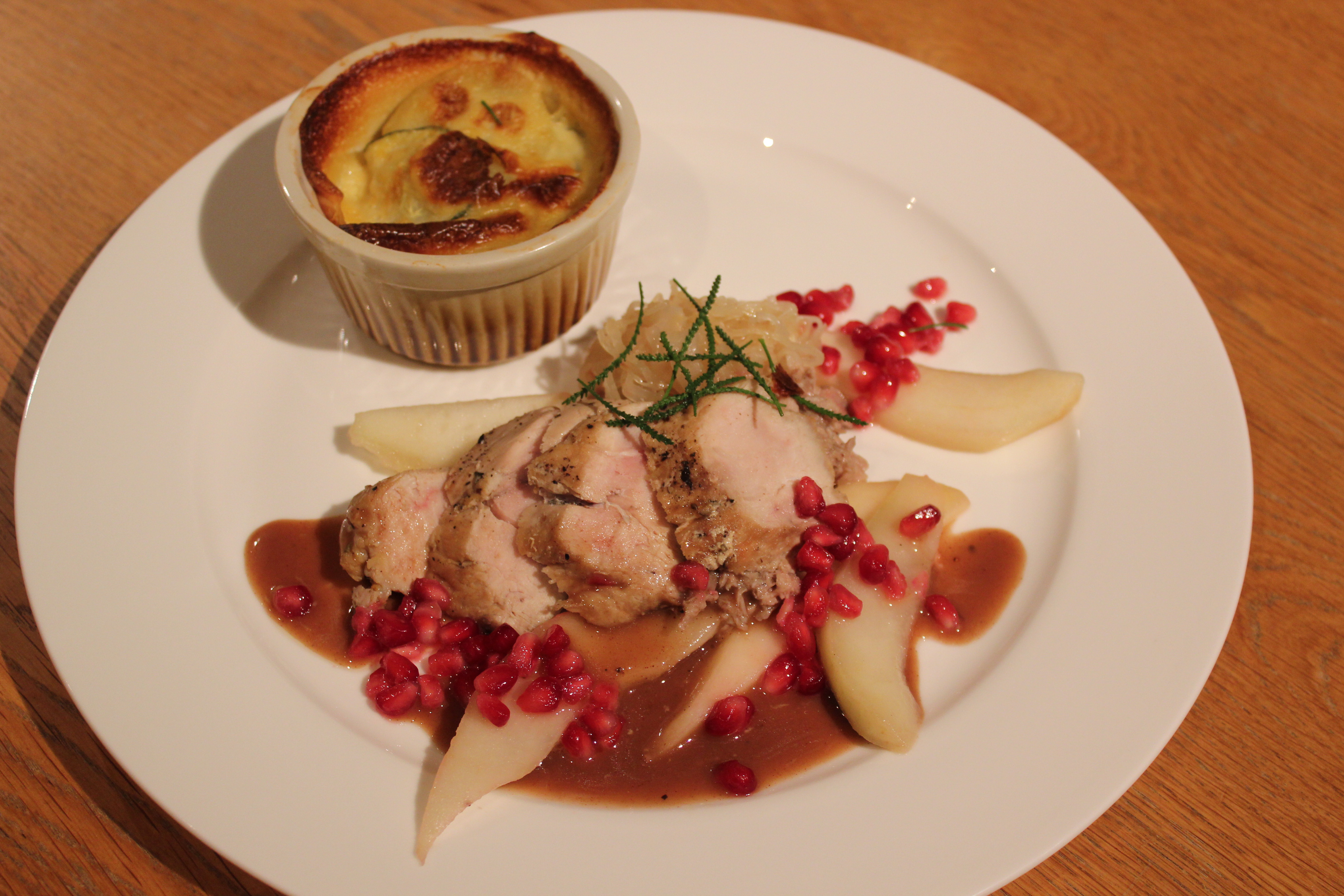 Fazant sous-vide / peer / granaatappel / gratin van aardappel met courget / kaassaus / kaneelpoeder / bouillon van fazant / perensap / zuurkool / pancetta /