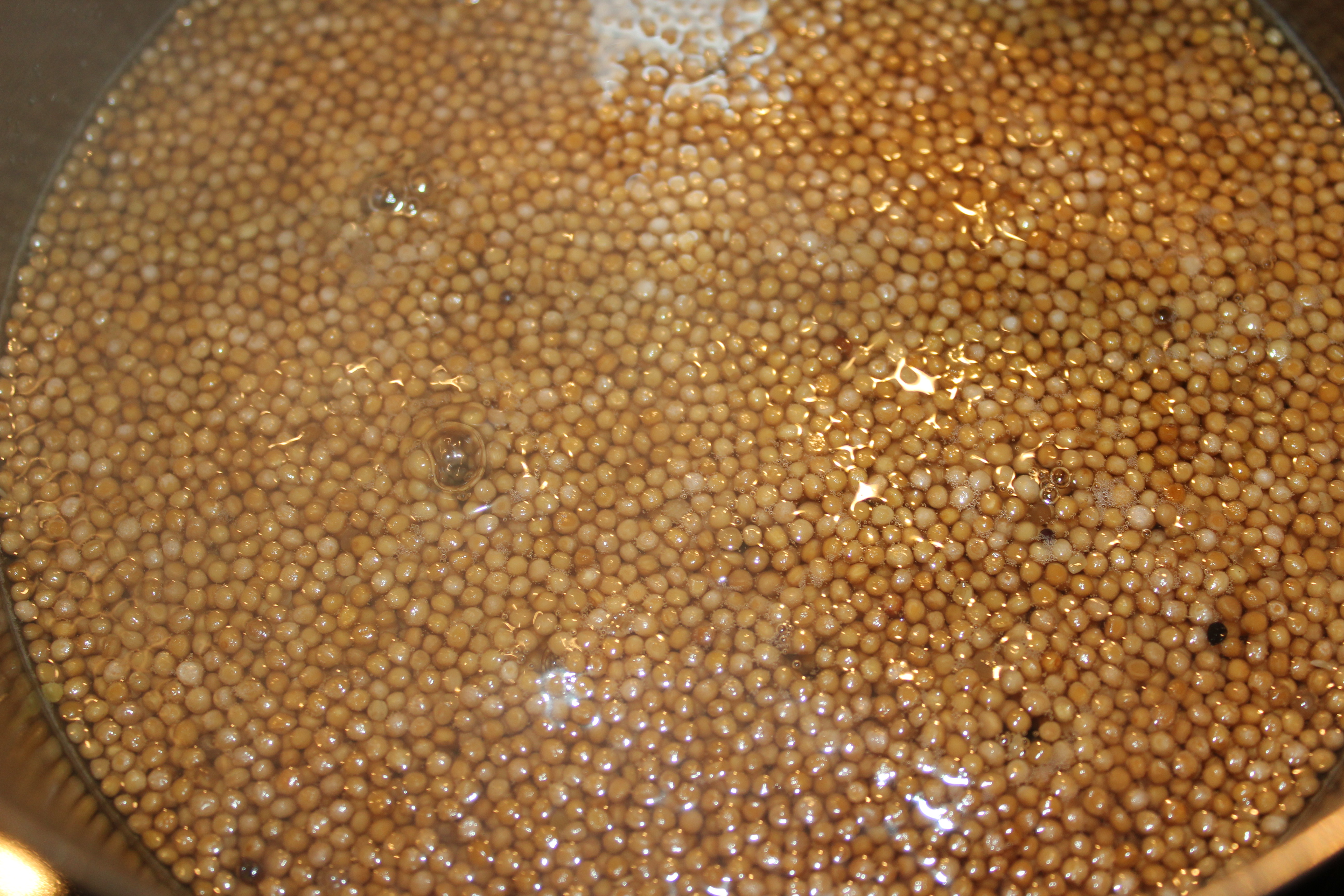 De zoetzure mosterdzaadjes….en dan nog de pitta-saus…alles past bij elkaar. Het sousvide vocht van het vlees zeven en inkoken met wat rode wijn. Nog wat porto-reductie bijgedaan, een beetje suiker en afgekruid….