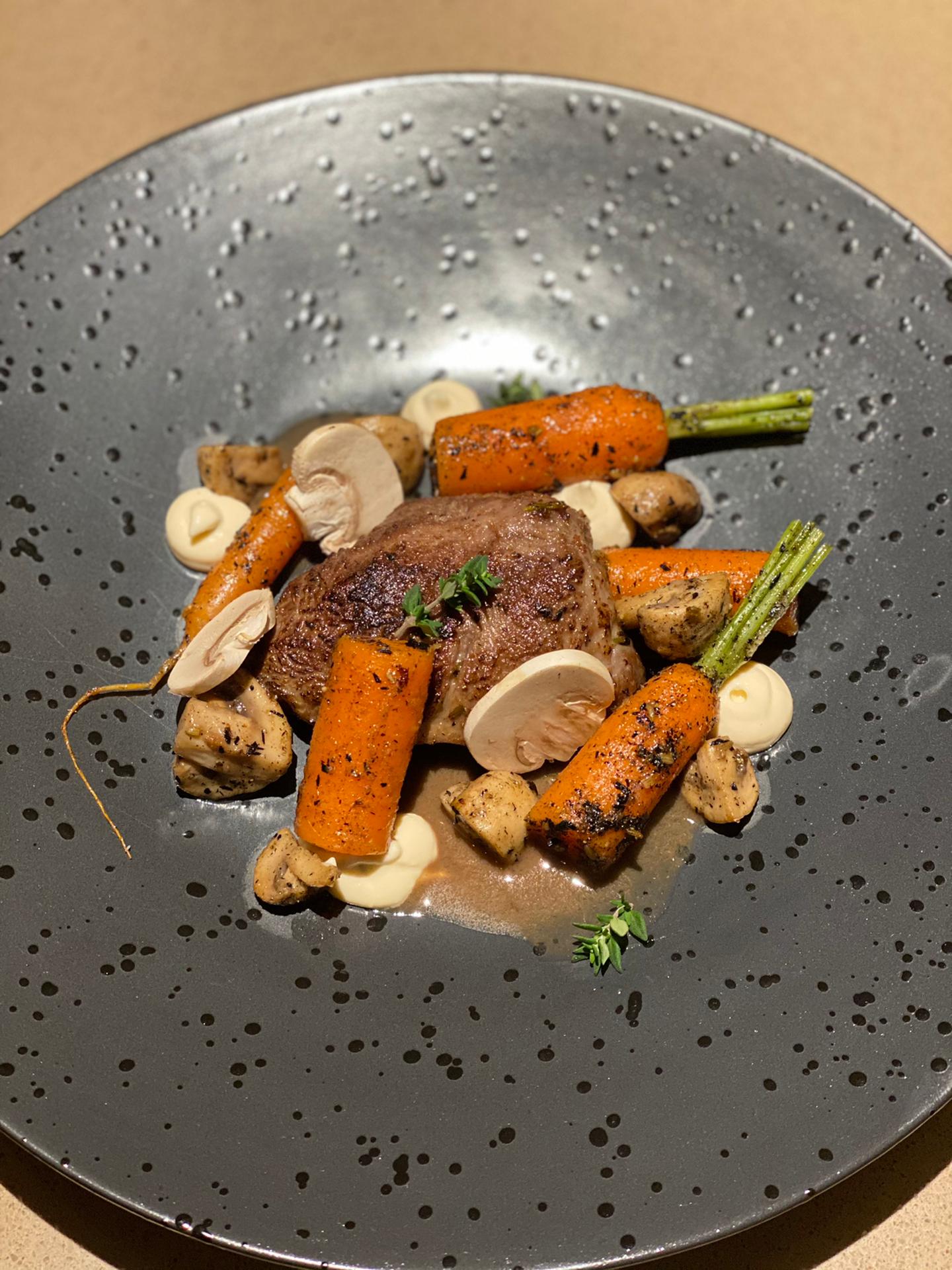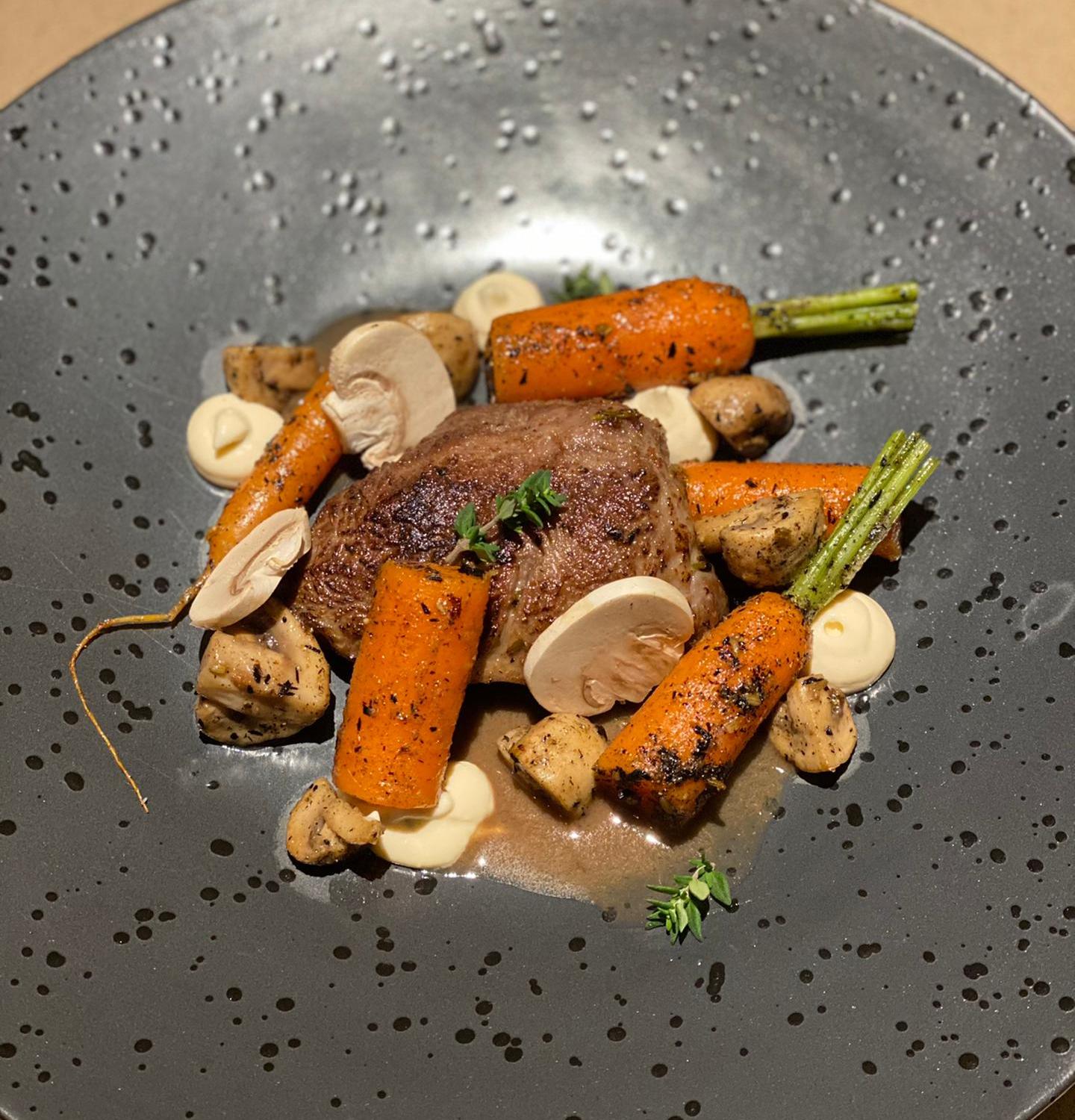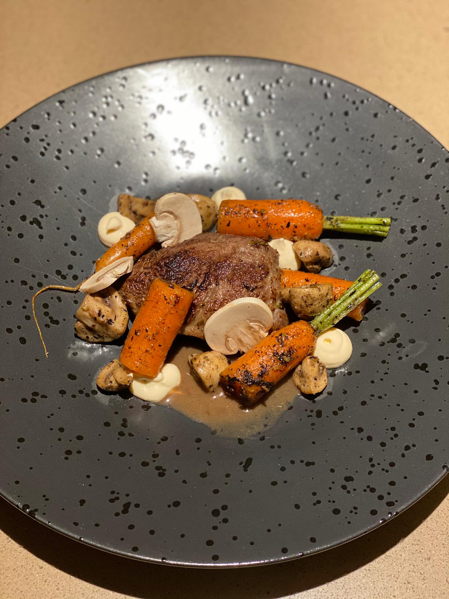 Sousvide gegaarde kalfswangen / mosterd / rozemarijn / tijm / mosterdzaad / rijstazijn / rode wijn / black gegrilde prei / komijnpoeder / venkelpoeder / winterwortel / champignons / aioli /