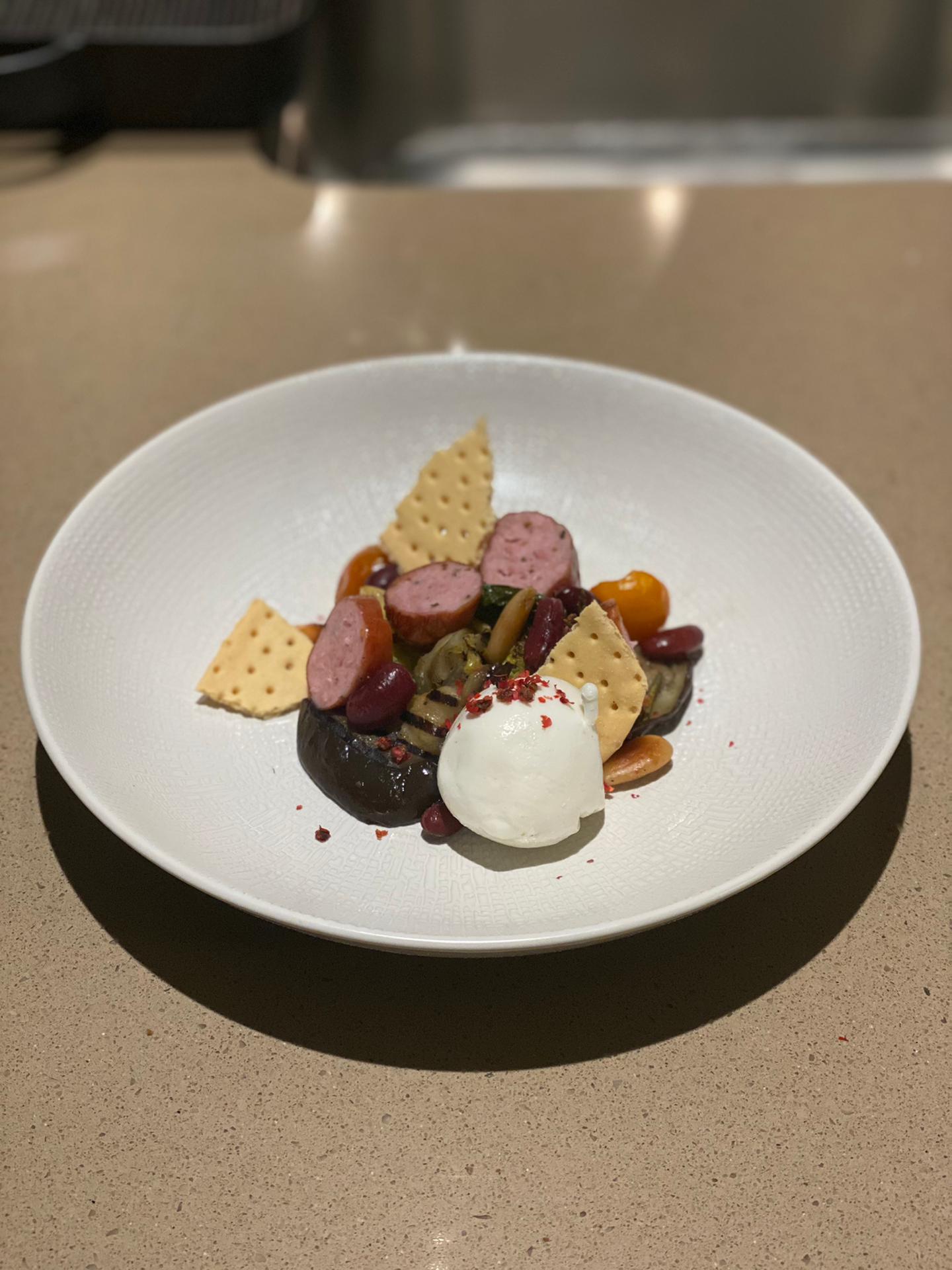 Worst van everzwijn / aubergine / kersttomaatjes / knoflook / rozemarijn / basilicum / suikersla / rode bonen / balsamicoazijn / amandelnoten / burrata / rode bessen peper / olijfolie / crackers /