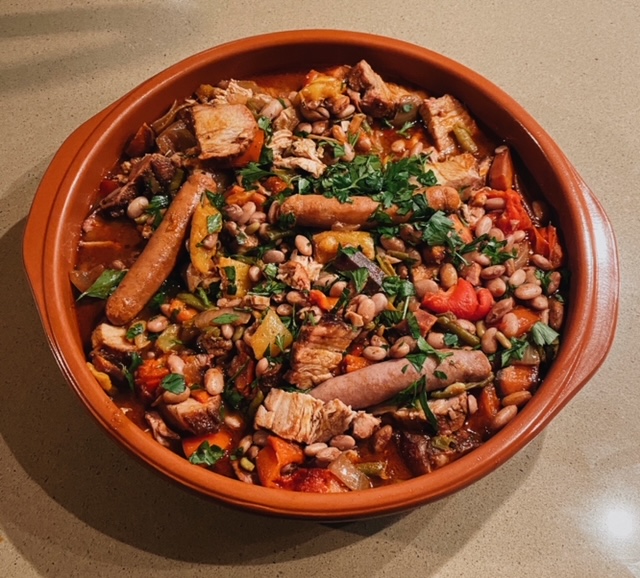 Cassoulet op de Big Green Egg | gekonfijte kippendijfilet | buikspek | Spaanse worstjes | bonen | paarse wortel | winterwortel | tomaat | ui | look | peterselie |