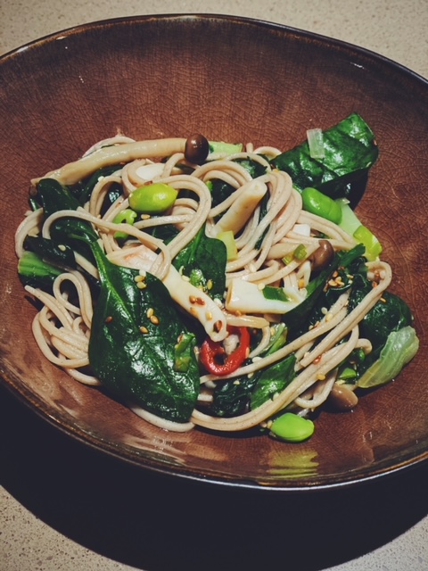 Scheermesjes | sobanoedels | edamame | paksoi | spinazie | chili peper | beukenzwam | lente ui | sojasaus | sesamzaadjes | Japans bier | gember | citroengras |
