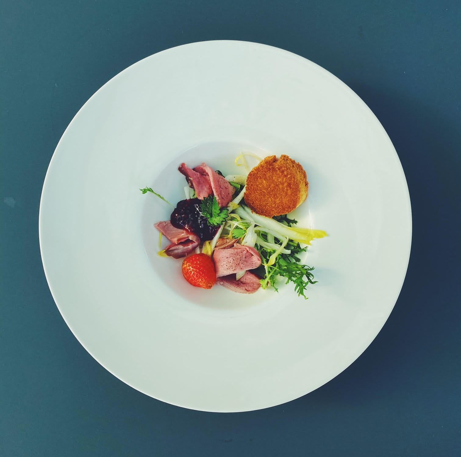 Met appelhout op BGE gerookte eend | witloofsalade | frisse | bessenconfituur | briochebrood | bessenvinaigrette | aardbei | peterselie |