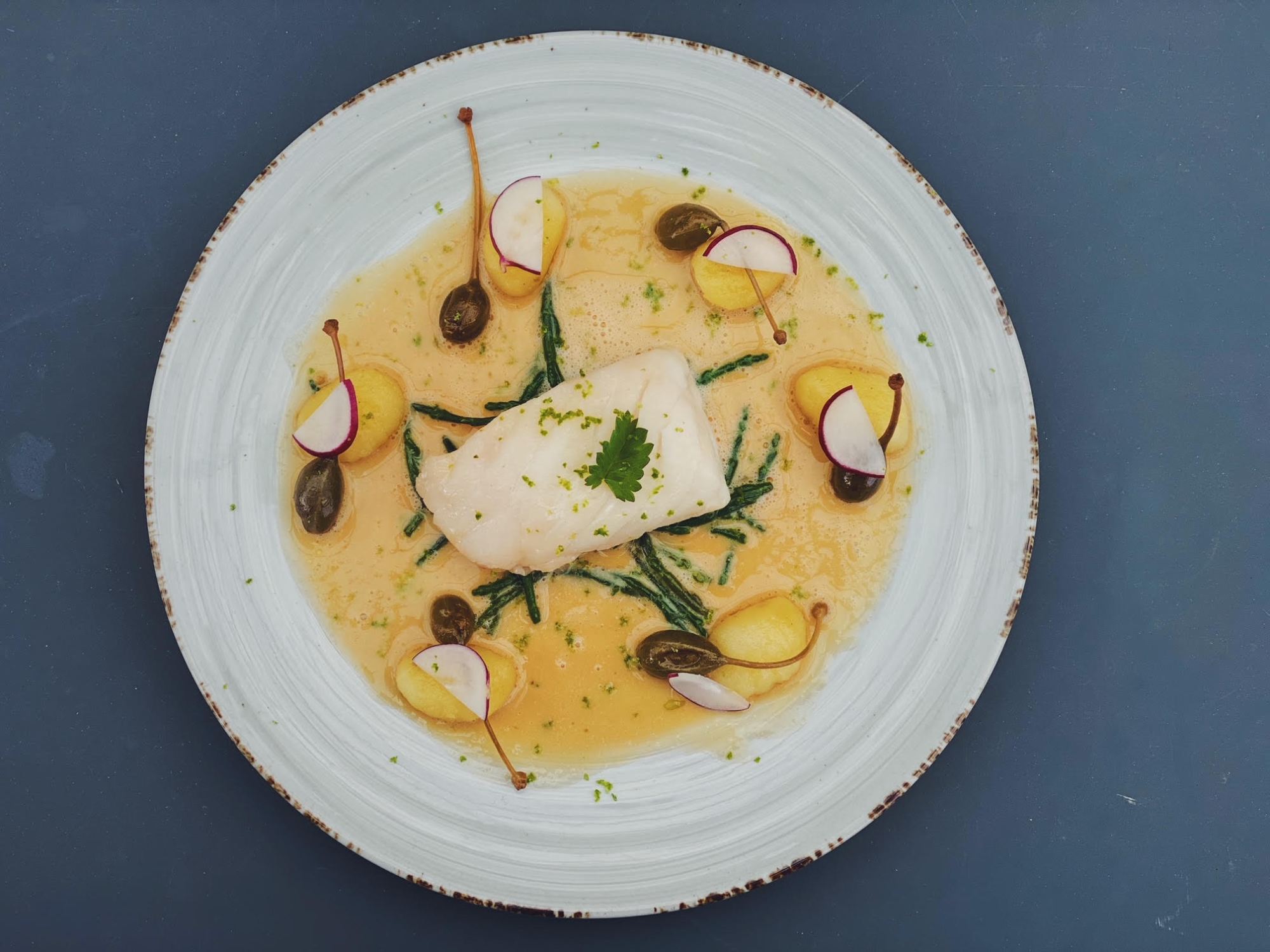 Sous-vide gegaarde kabeljauw | beurre blanc van sambai | gnocchi | kapperappeltjes | zeekraal | radijs | limoen |