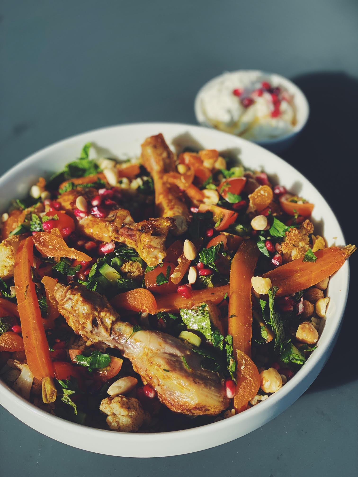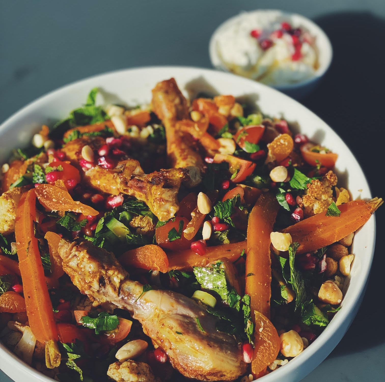 Kip | bulgur | bloemkool | wortel | kikkererwten | granaatappel | kerstomaten | chermoula | abrikoos | hazelnoten | munt | Labneh |