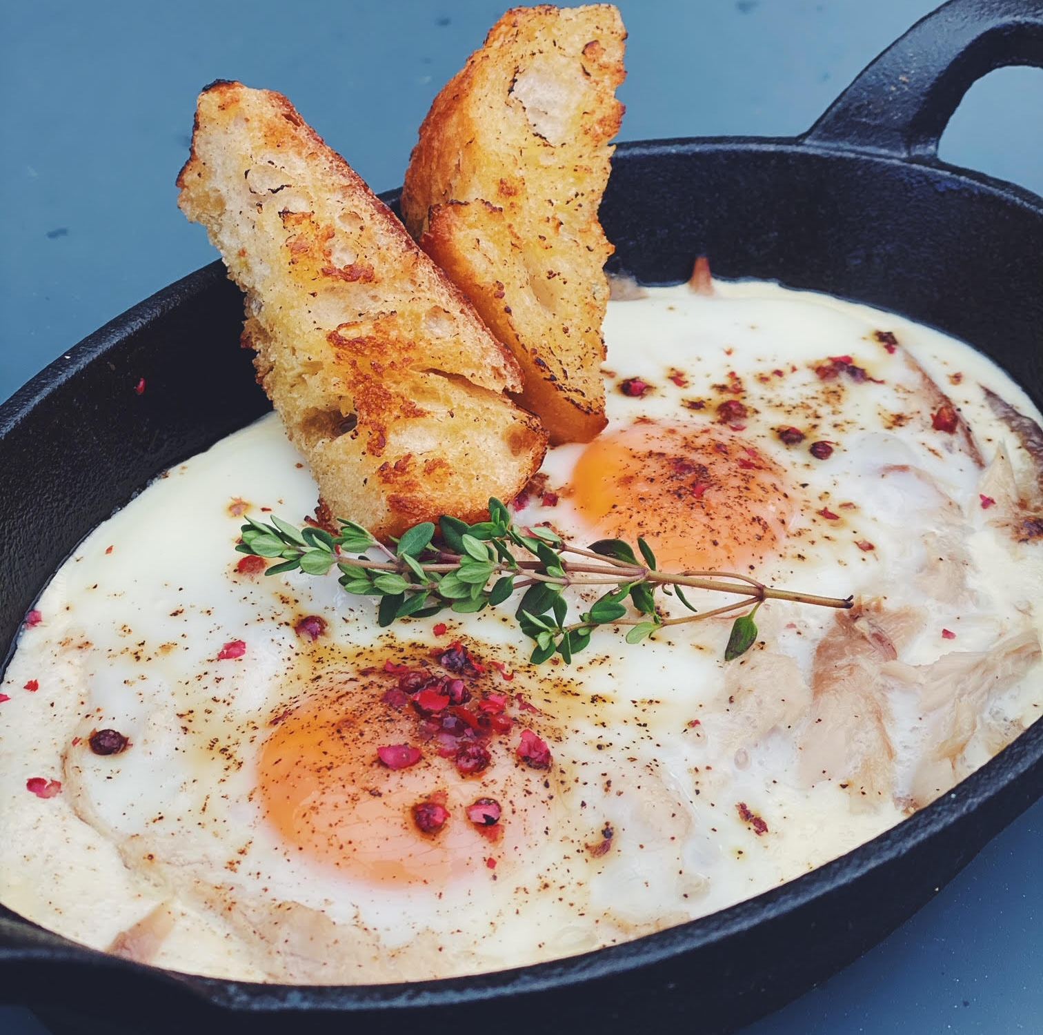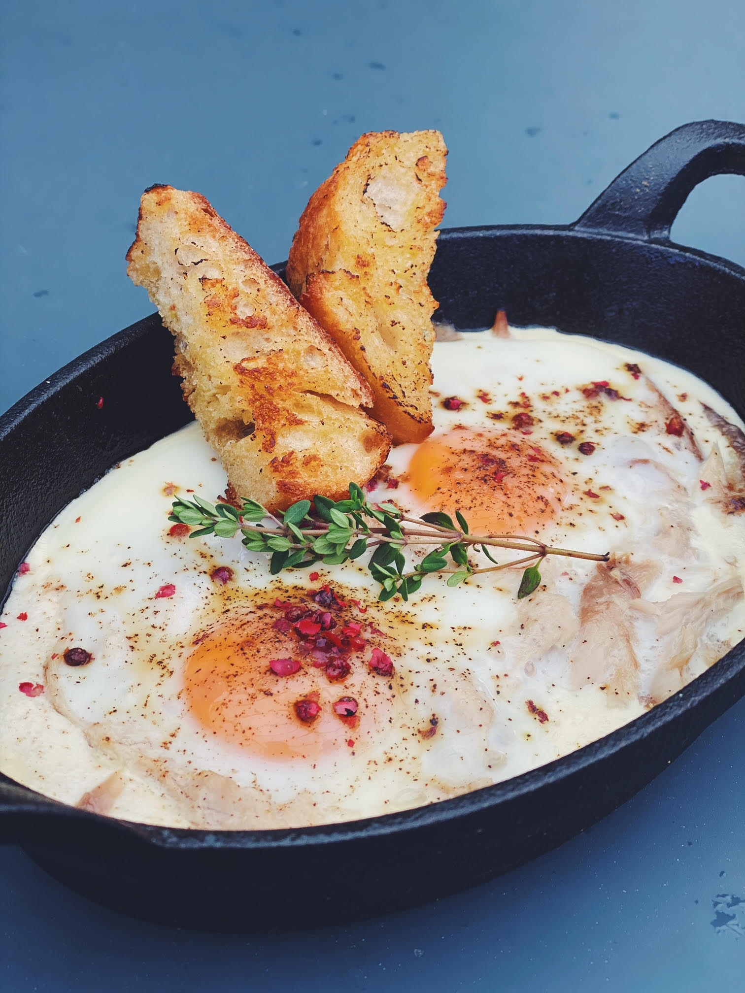 Oeufs cocotte | gerookte makreel | mierikswortelroom | roze peper |