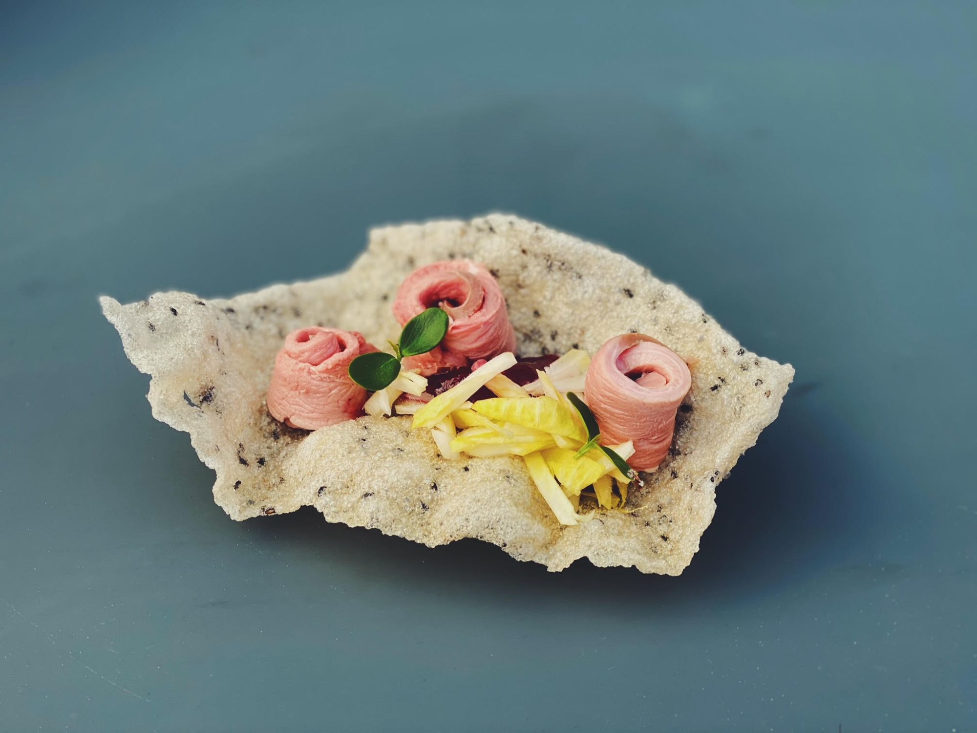 Met appelhout op BGE gerookte eend | rijstpapier | veenbessen | witloof | Tahoon cress |