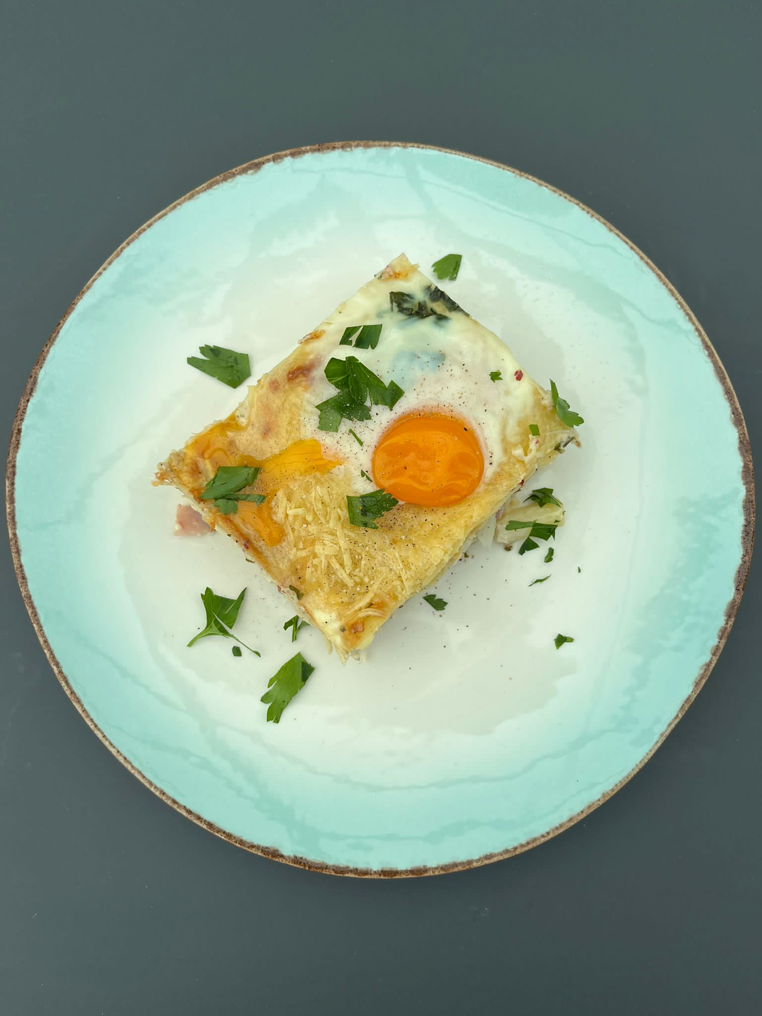 30 minuten in oven en dan uitnemen en eitjes erover en nog even nabakken in oven.