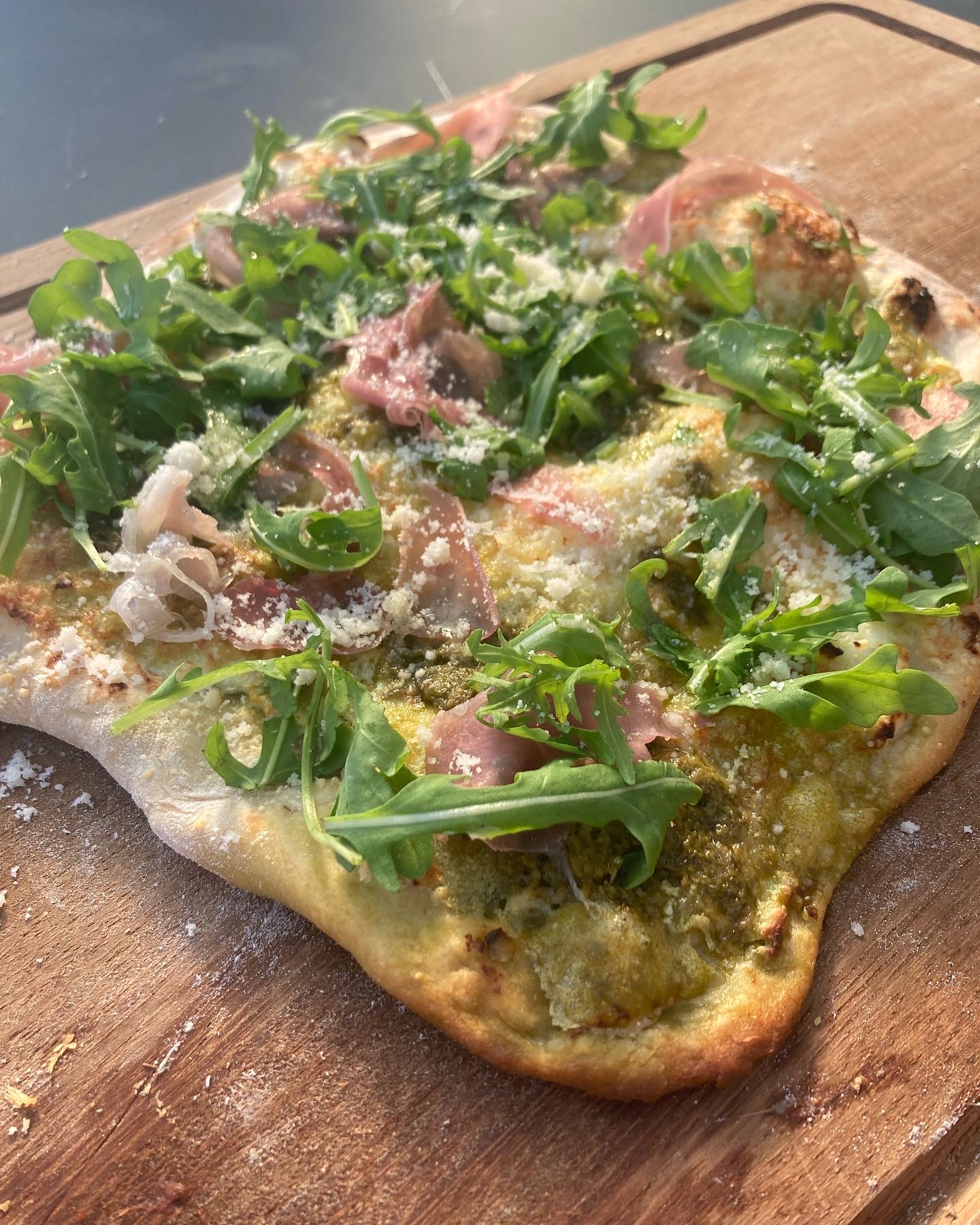 Voor de Pizza Bianco: parmaham, groene pesto, ricotta, rucola, Parmezaanse kaas.