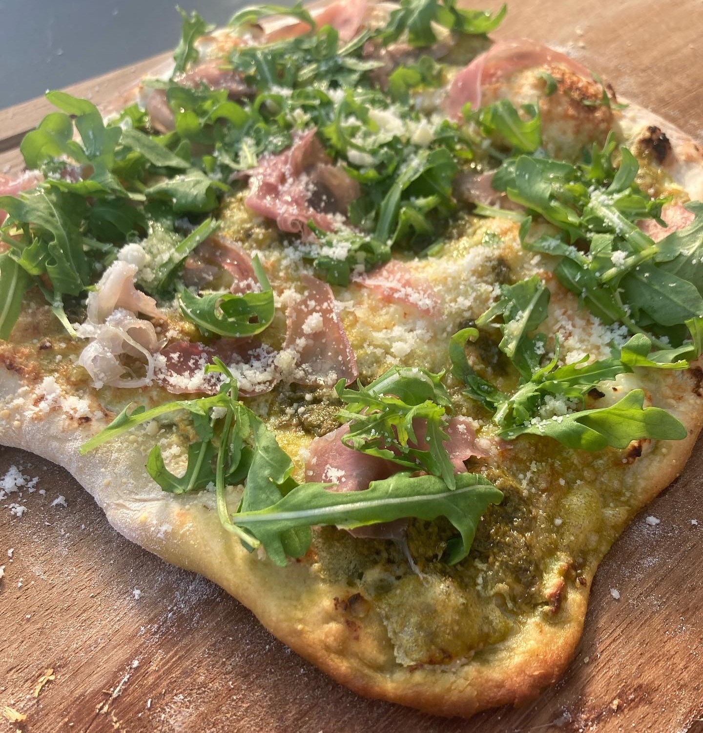 Voor de Pizza Bianco: parmaham, groene pesto, ricotta, rucola, Parmezaanse kaas.