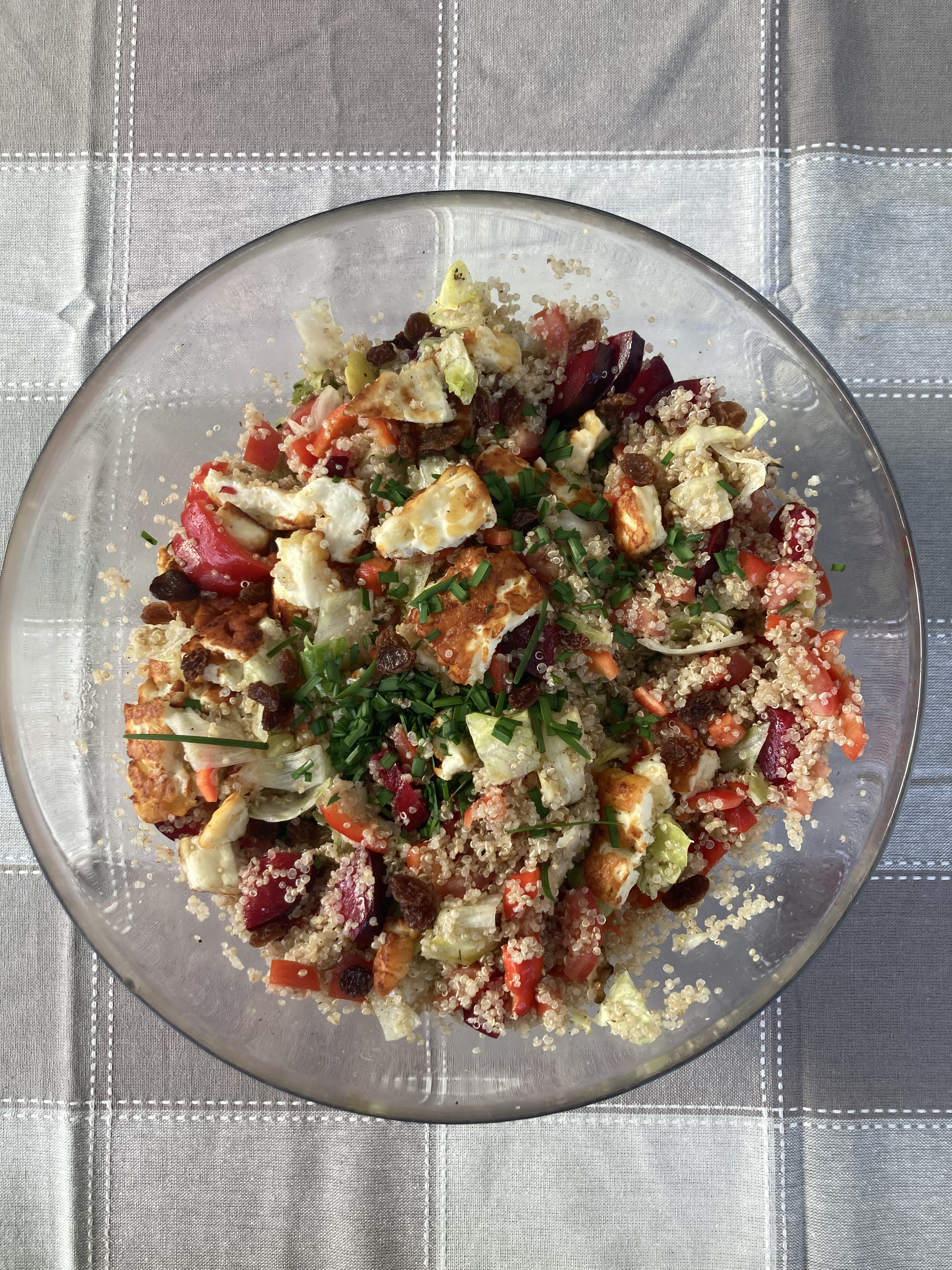 Quinoa met gebakken Berloumi, tomaat, zoete praprika, ijsbergsalade, walnoten, rozijnen, verse rode pruimen, bieslook, lookolie, citroen.