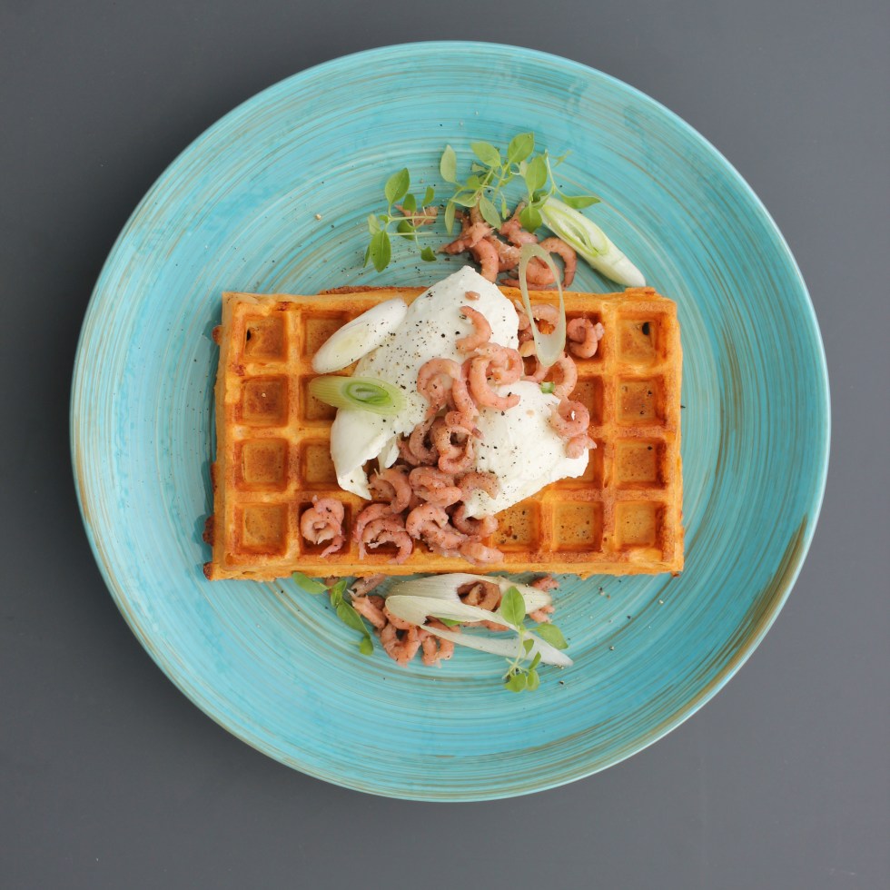 Wafel, pesto, mozzarella, grijze garnalen