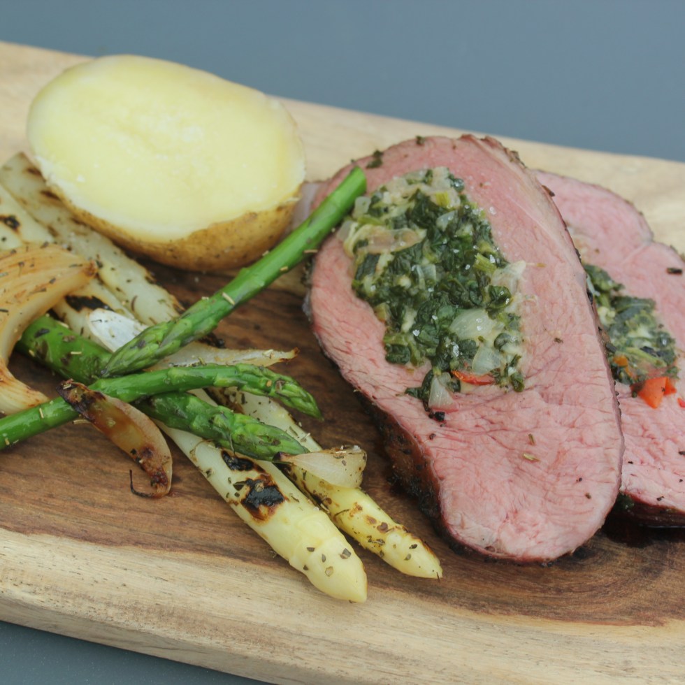 Gevulde Picanha van kalf, grillaardappel, gegrilde asperges