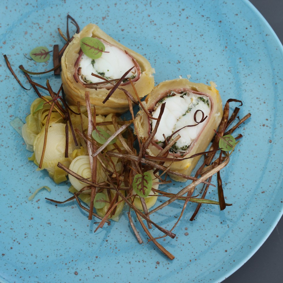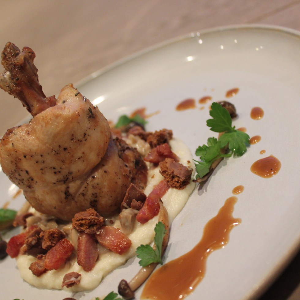 Parelhoen, peterseliewortel, champignons, virtuoso-koekjes