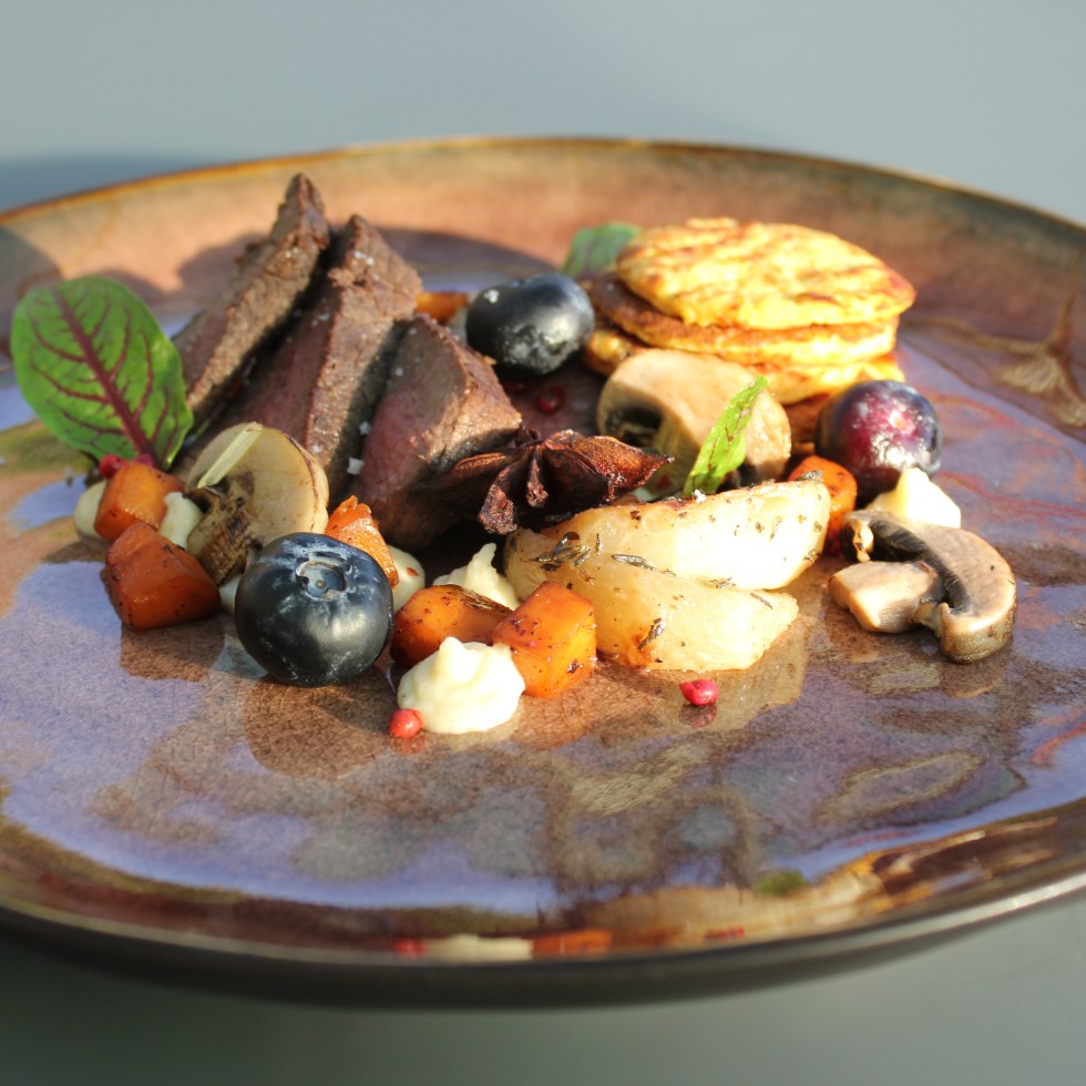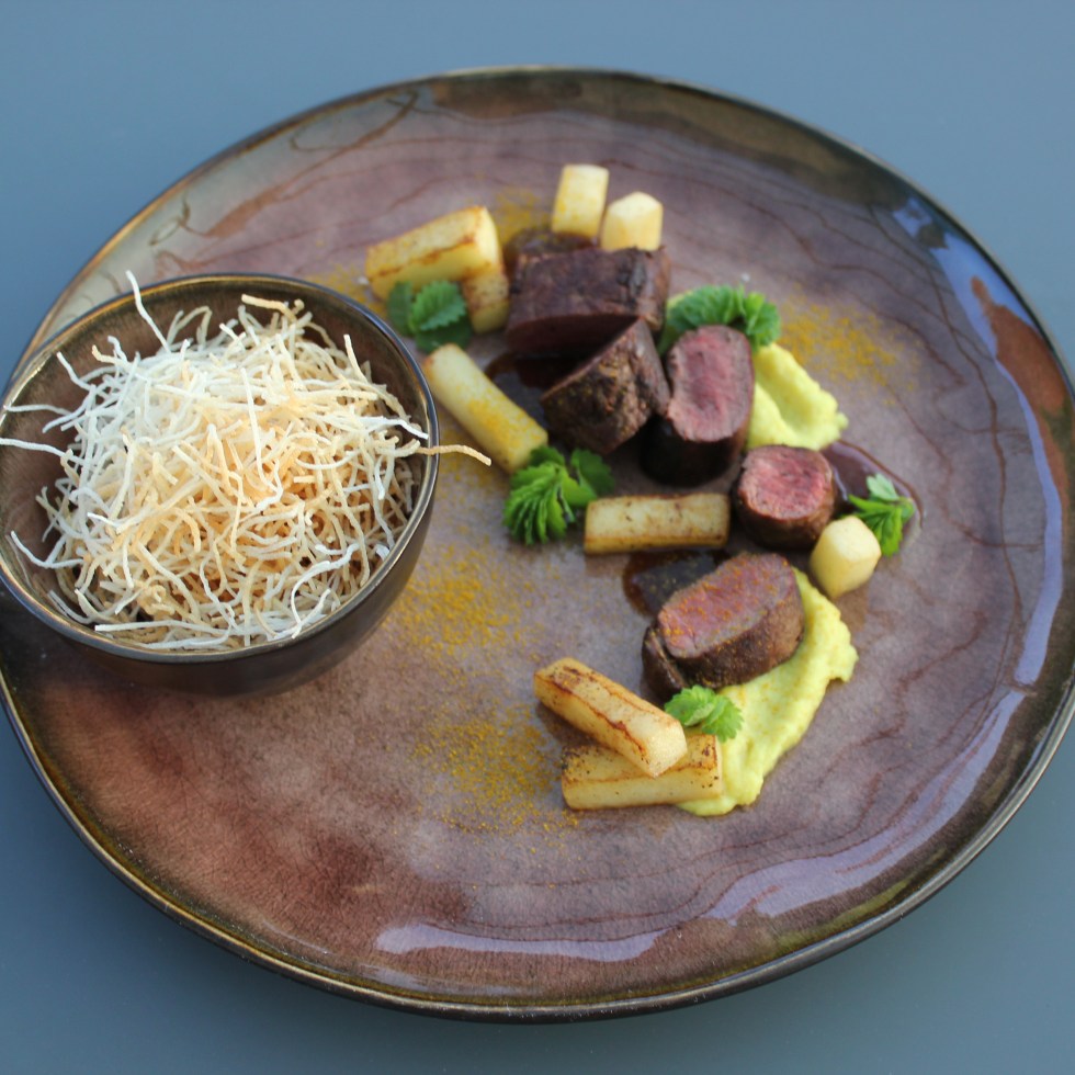 Hazenrugfilet, appeltjes, jeneverbessensaus, kadayif