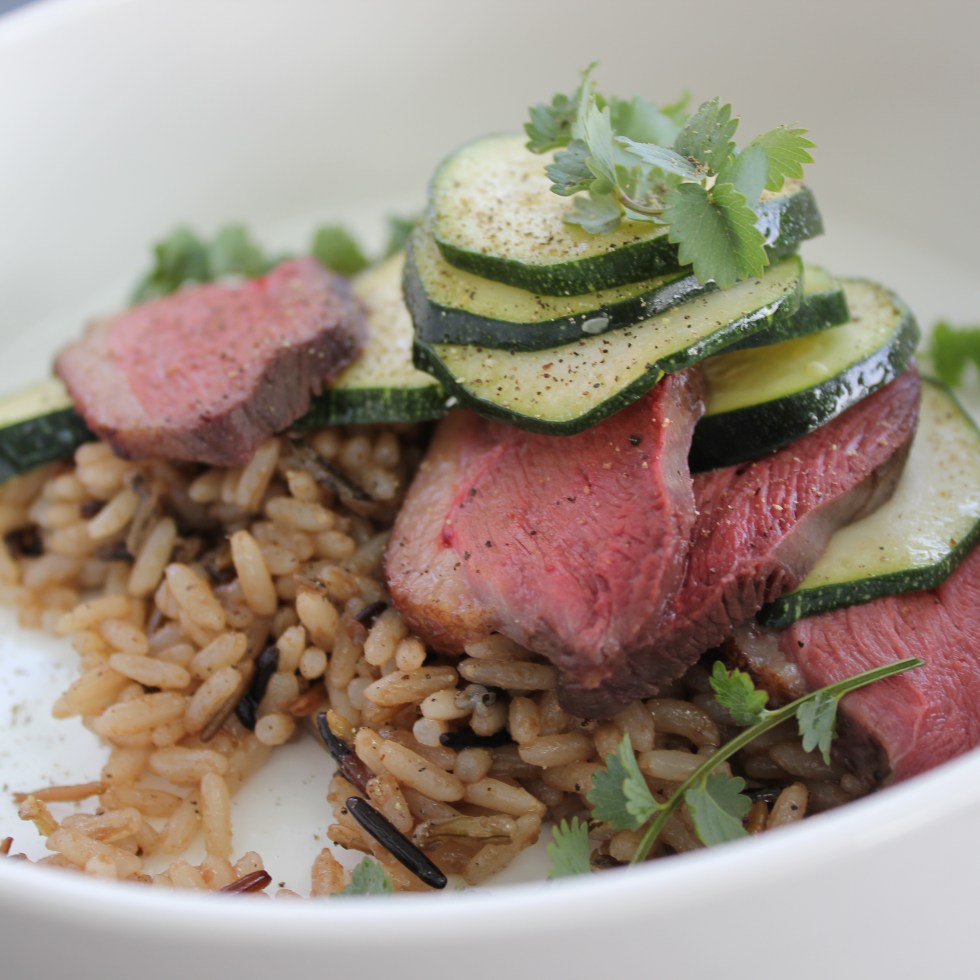 Rijst, gerookte eend, courgette