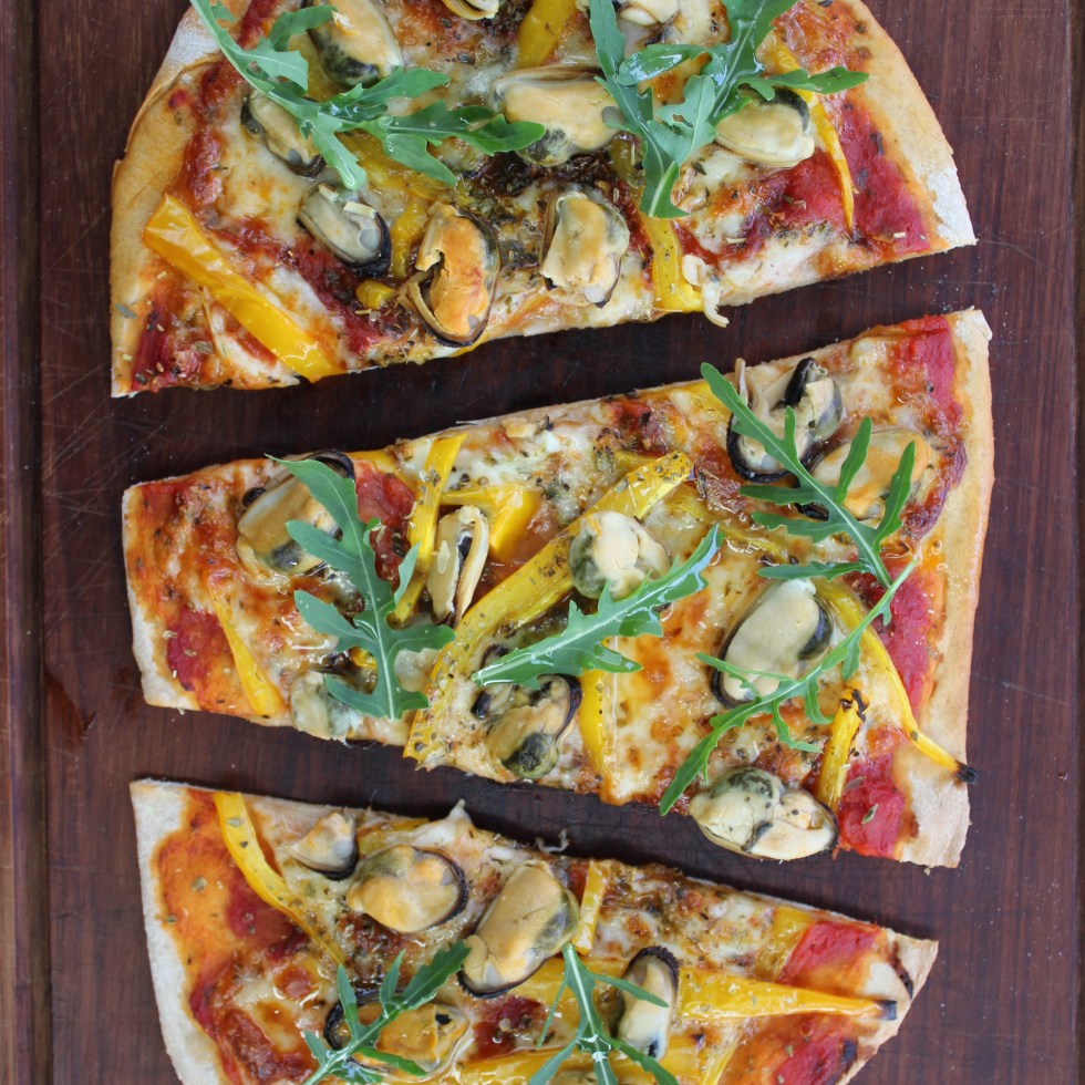 Pizza, mosselen, gele paprika