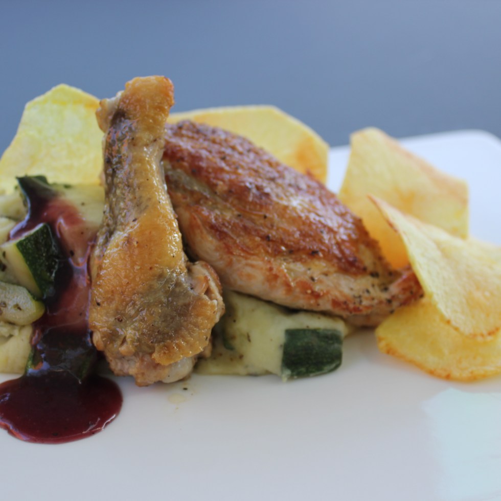 Parelhoen, puree, courgette