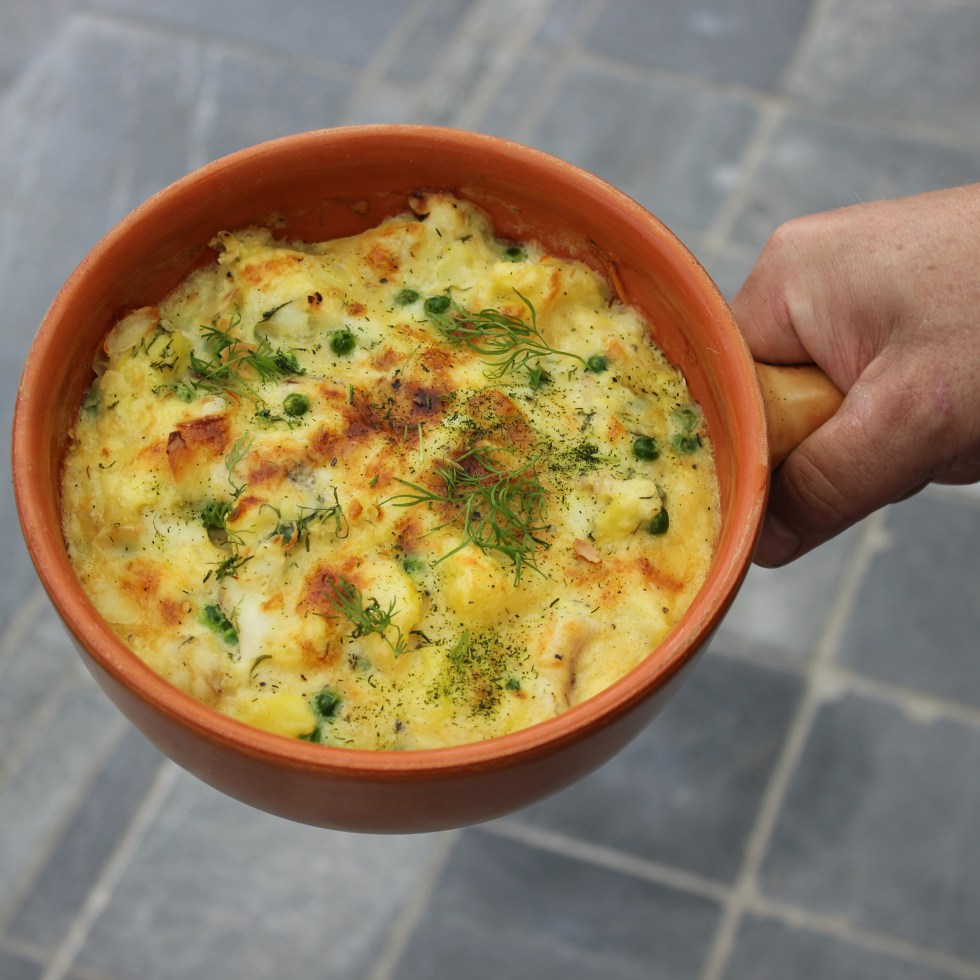 Clafoutis, heek, aardappel, erwten