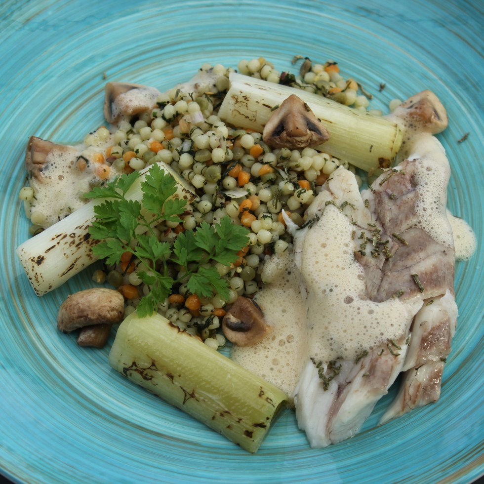 Corvina in zoutkorst, couscous, porei