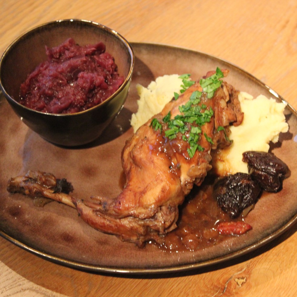 Konijn, pruimen, rode kool