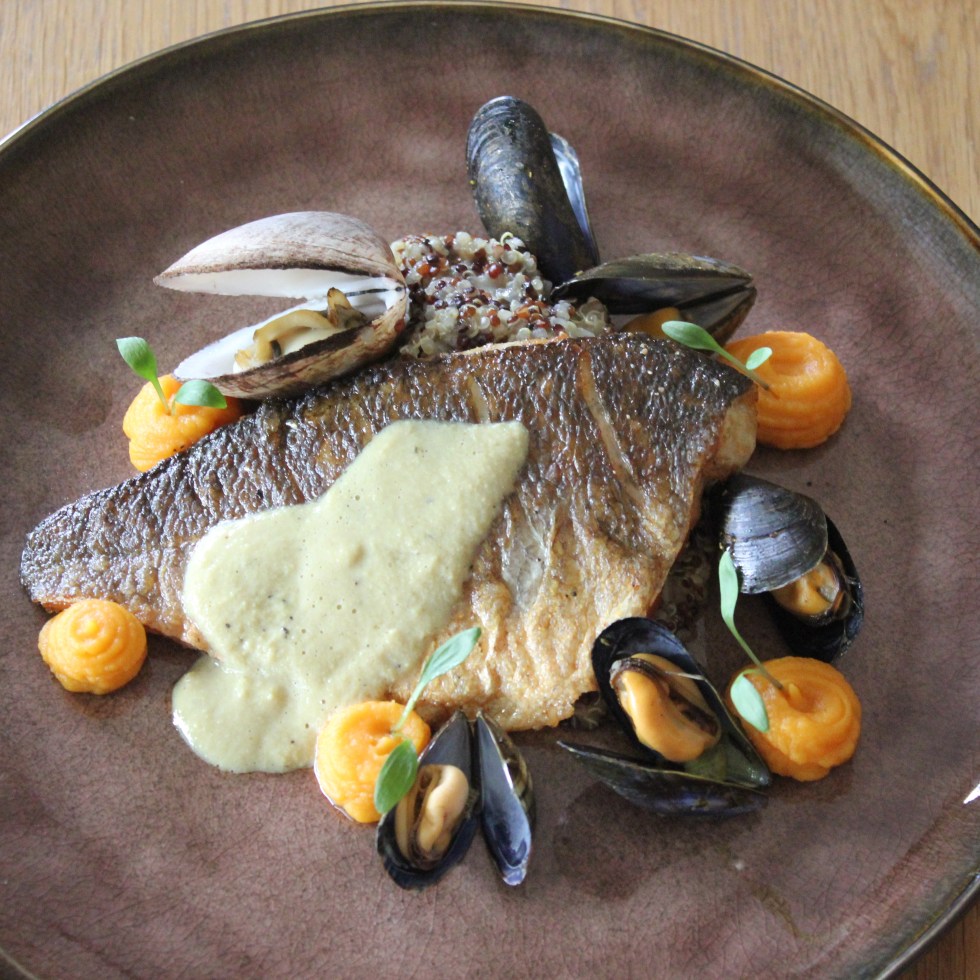 Zeebaarsfilet, kokkels, mosselen, quinoa
